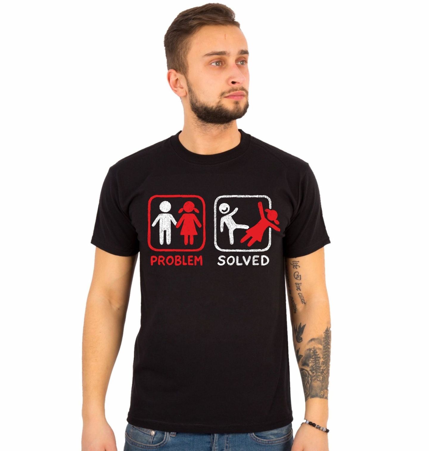 Pánské tričko Problémy ve vztahu? Problem solved - Rozchod. Výrazný nápis „Problem / Solved“ doplněný jednoduchými ikonami vytváří satirický a provokativní motiv, který si bere na mušku vztah a dynamiku mezi partnery. Grafika využívá kontrastu a ironie, díky čemuž okamžitě upoutá pozornost a vyvolá reakci.
