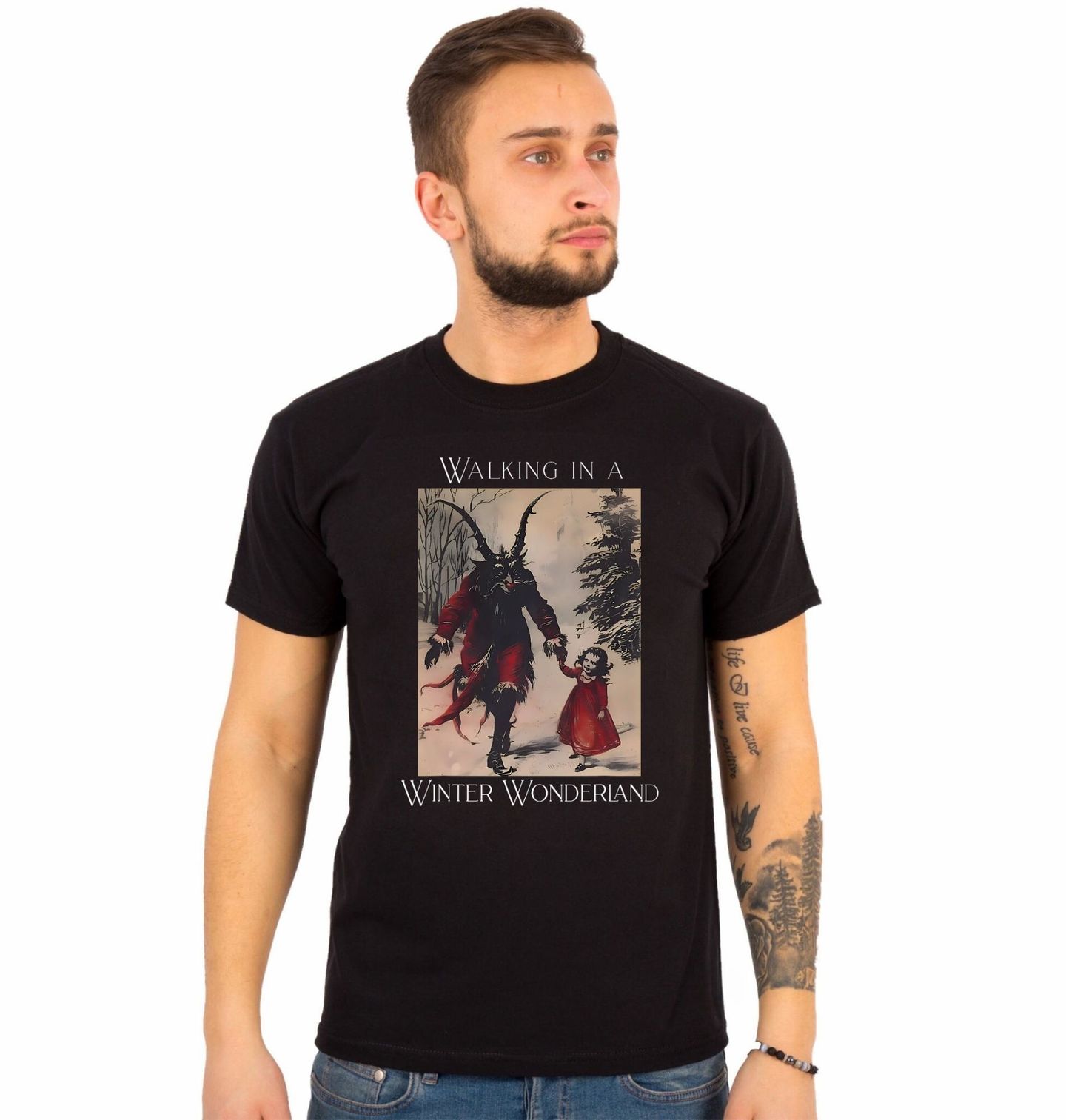 Pánské tričko Procházka s Krampusem v Zimní říši divů. Zatímco známá vánoční píseň „Walking in a Winter Wonderland“ česky „Procházka v zimní říší divů“ evokuje pohodu, zde se objevuje temnější verze – Krampus vede malé děvčátko zasněženou zimní krajinou. Design spojuje tradiční Vánoce se strašidelným Krampusem, který trestá zlobivé děti.