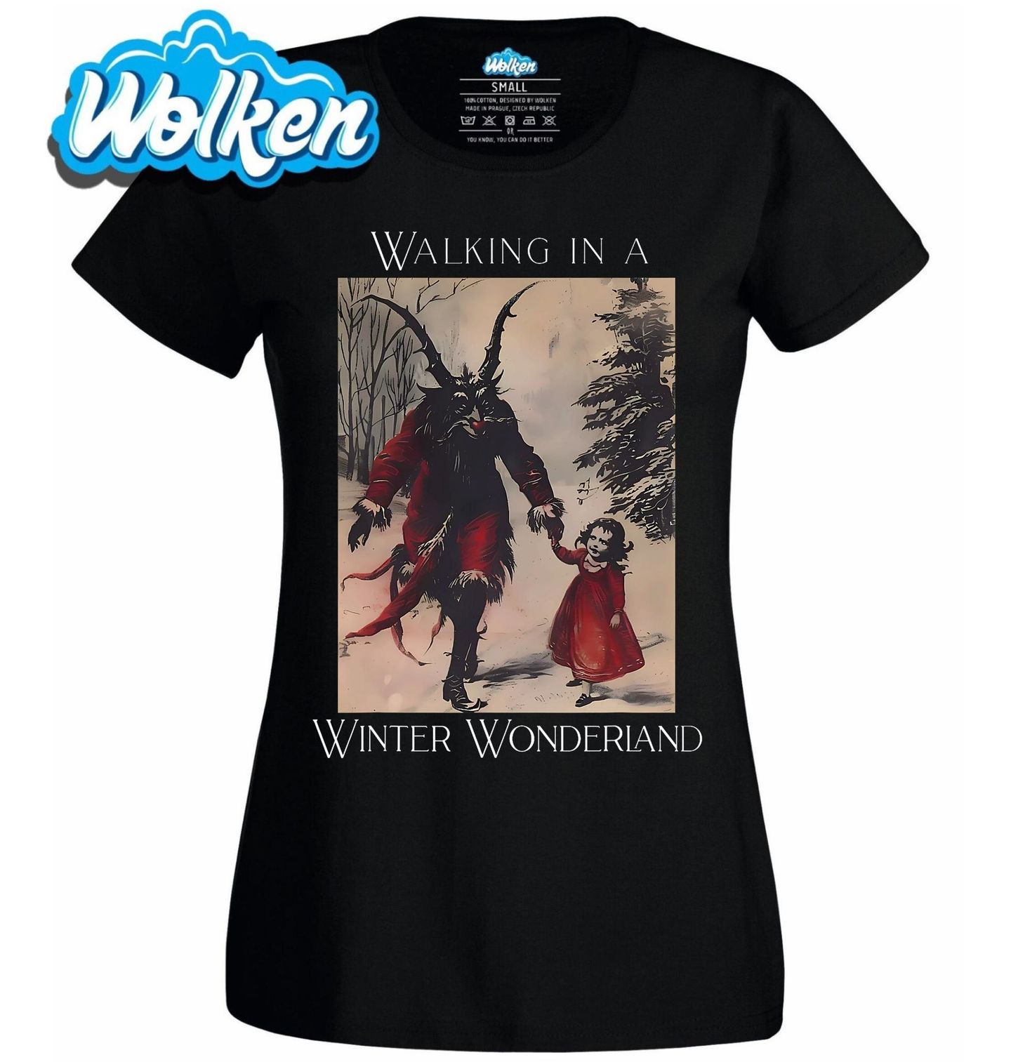 Dámské tričko Procházka s Krampusem v Zimní říši divů. Zatímco známá vánoční píseň „Walking in a Winter Wonderland“ česky „Procházka v zimní říší divů“ evokuje pohodu, zde se objevuje temnější verze – Krampus vede malé děvčátko zasněženou zimní krajinou. Design spojuje tradiční Vánoce se strašidelným Krampusem, který trestá zlobivé děti.