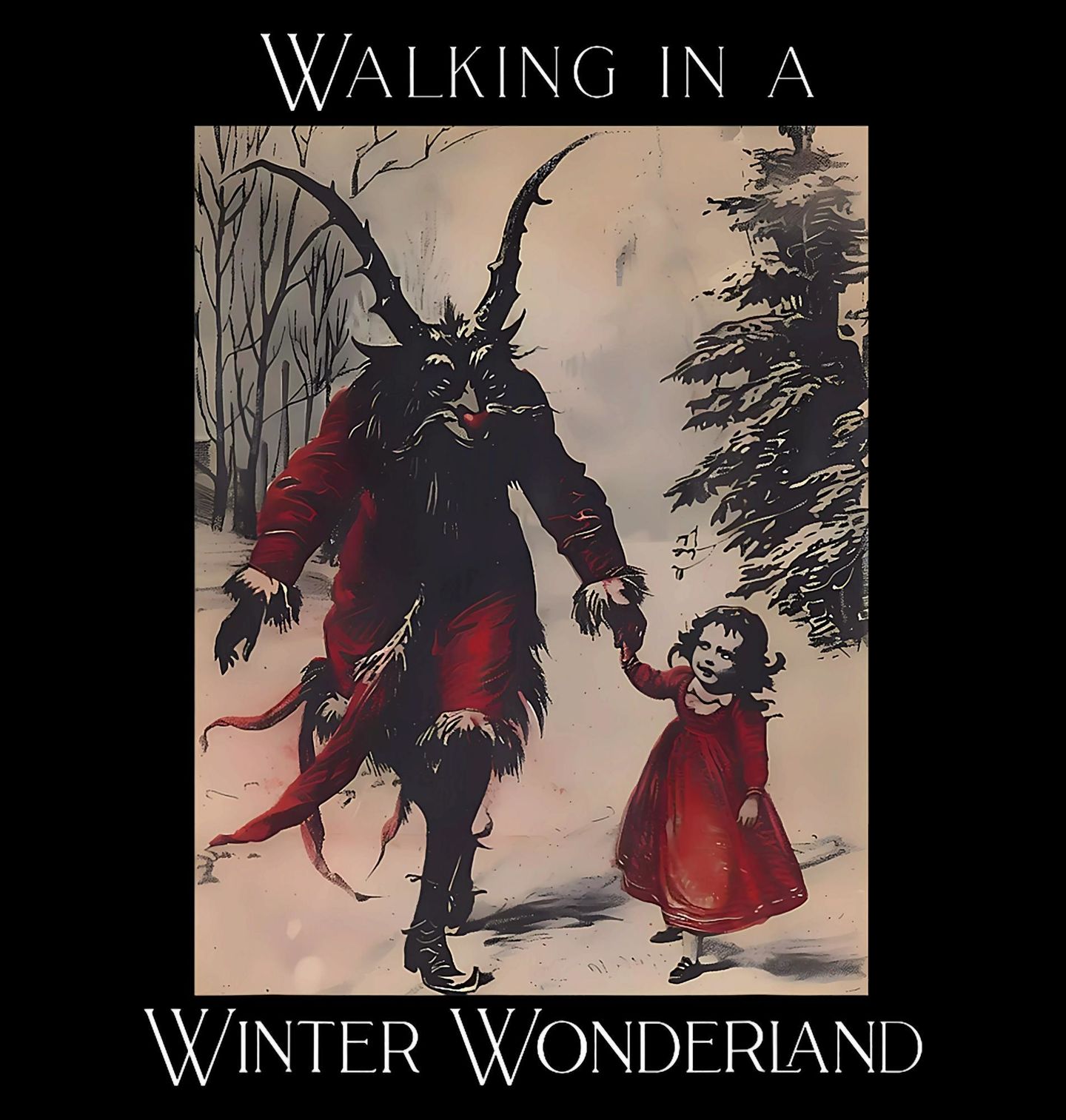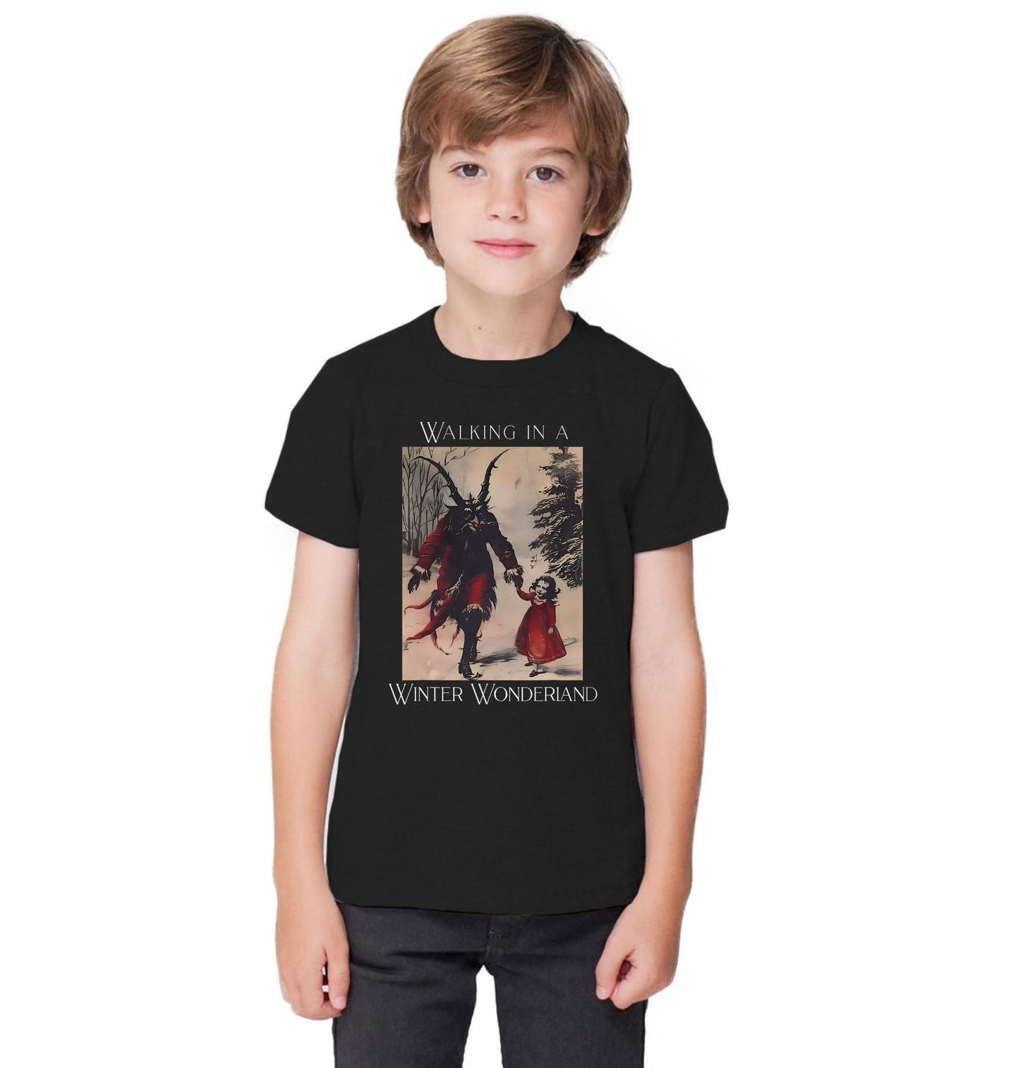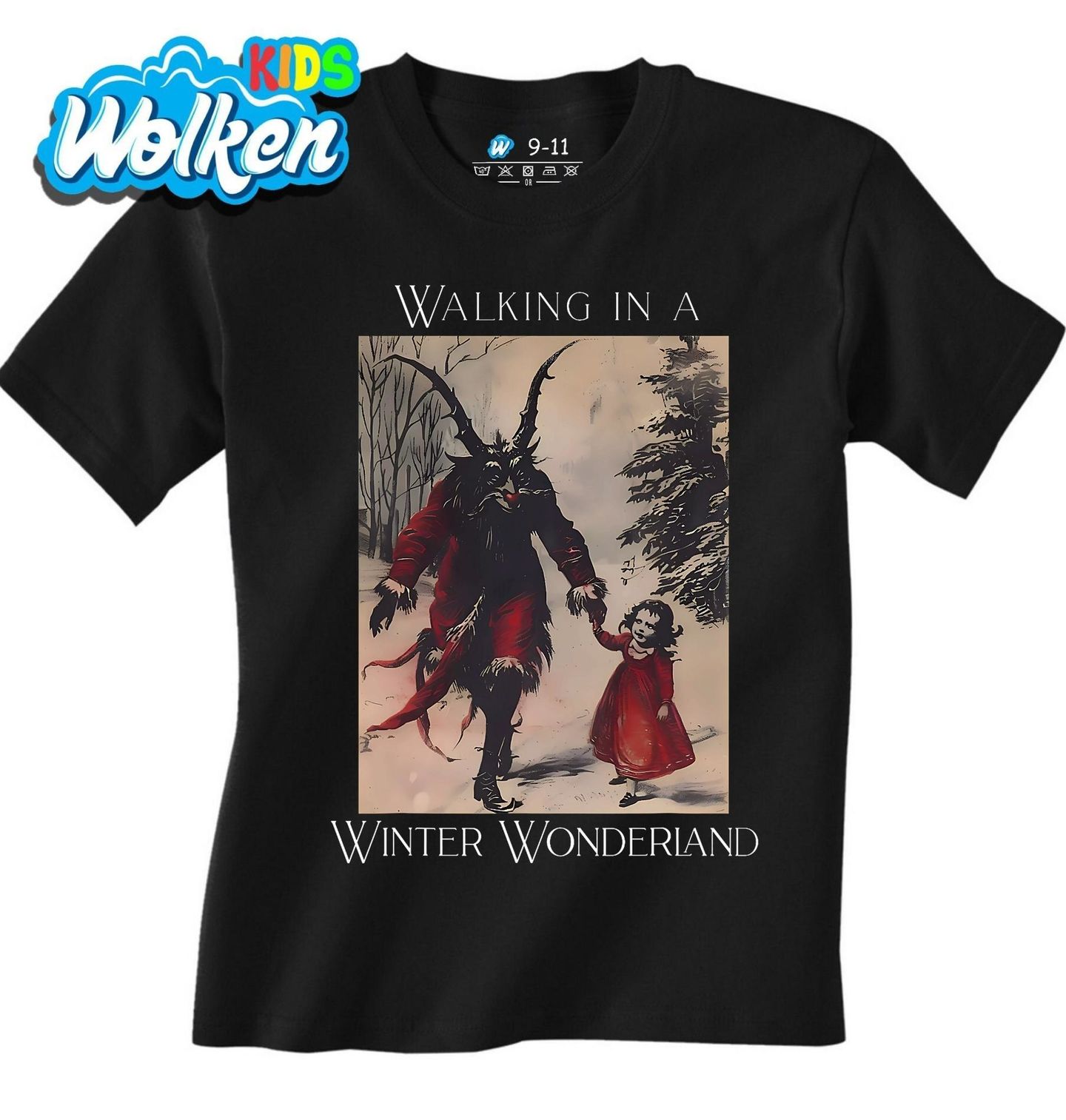 Dětské tričko Procházka s Krampusem v Zimní říši divů. Zatímco známá vánoční píseň „Walking in a Winter Wonderland“ česky „Procházka v zimní říší divů“ evokuje pohodu, zde se objevuje temnější verze – Krampus vede malé děvčátko zasněženou zimní krajinou. Design spojuje tradiční Vánoce se strašidelným Krampusem, který trestá zlobivé děti.