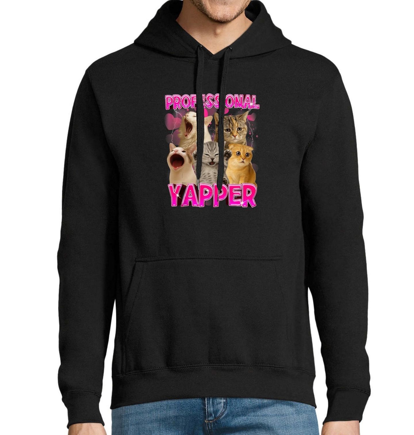 Pánská mikina Profesionální Kočičí Yapper. Tohle tričko je absolutní must-have pro každého, kdo miluje kočky, meme humor a ví, jak vypadá mozek rozvařený od scrollování. "Professional yapper" je stav mysli – kombinace chaosu a brainrodu.
