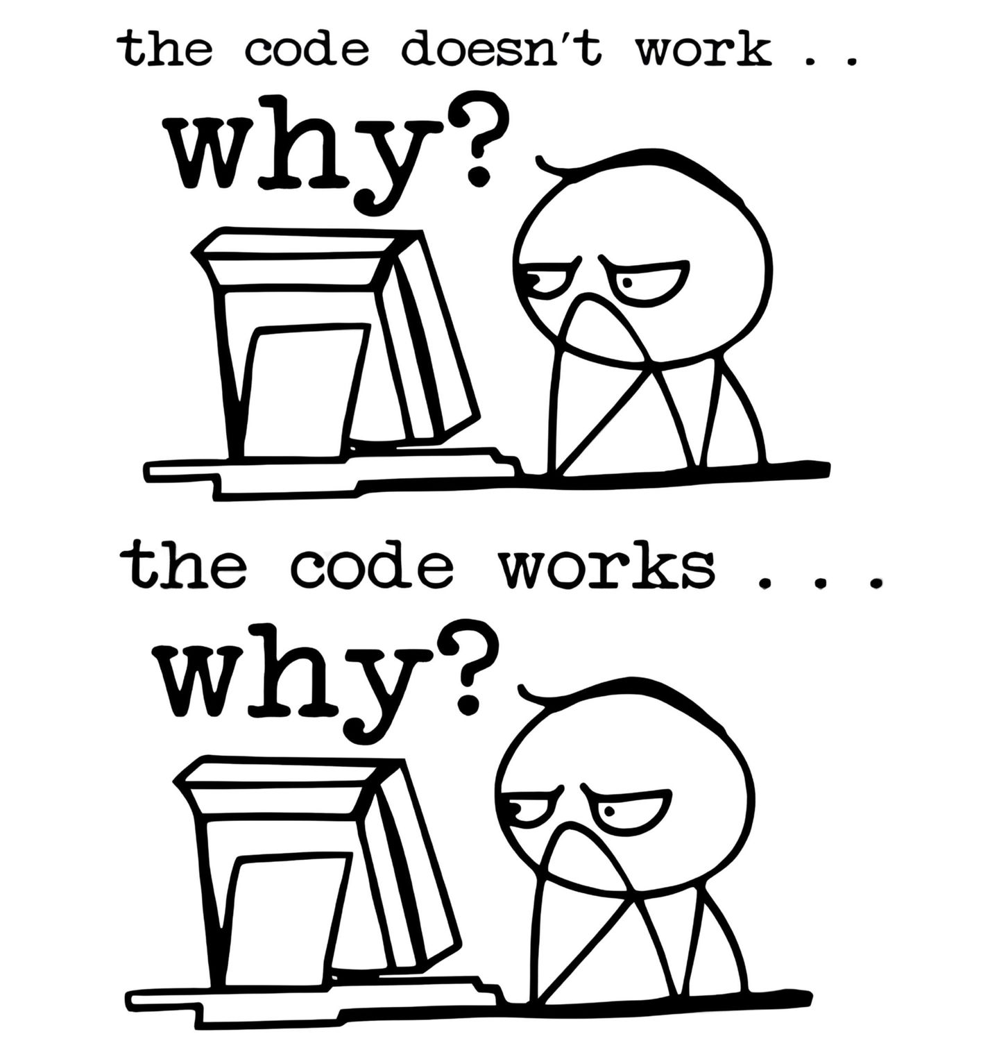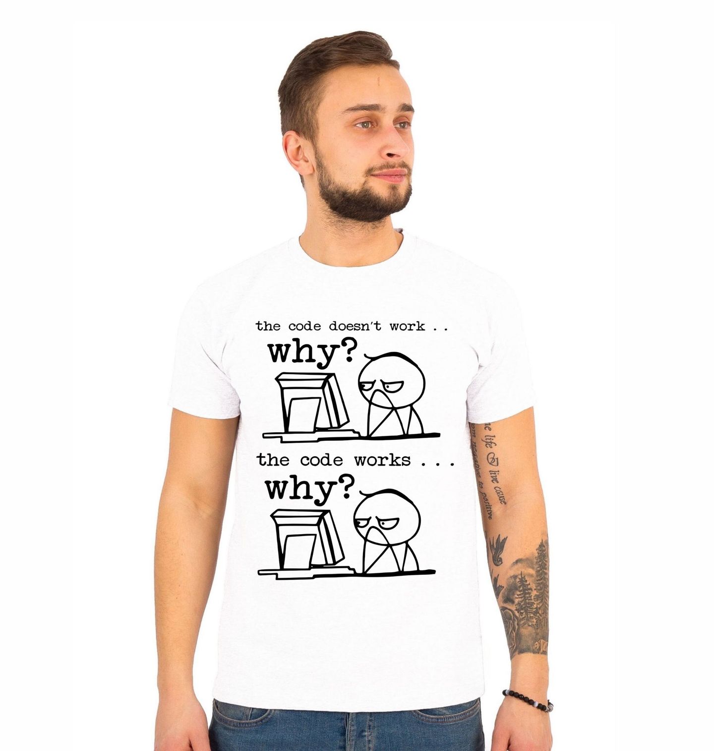 Pánské tričko Programátorská Krize Why? Vtipná ilustrace ze světa IT s textem „The code doesn’t work… why?“ a „The code works… why?“ (Kód nefunguje… proč? Kód funguje… proč?). Tento motiv „programátor meme“ dokonale vystihuje frustraci i ironii práce s kódem. Ideální pro programátory, vývojáře a všechny, kdo znají realitu ladění softwaru.