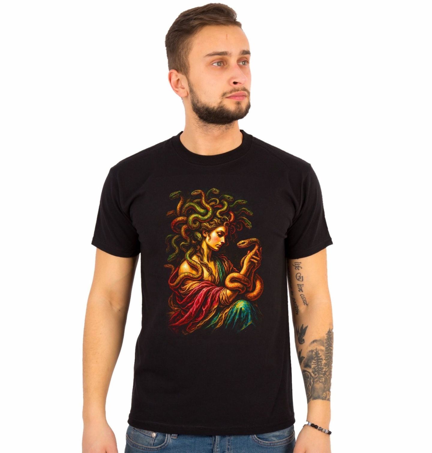 Pánské tričko Prokletá Medúza. Tento výrazný motiv zobrazuje Medúzu, jednu z nejznámějších postav, kterou řecká mytologie kdy stvořila. Medúza byla původně krásná žena, ale po prokletí bohyně Athény se proměnila v bytost s hady místo vlasů a pohledem, který dokázal každého proměnit v kámen. Řecká mytologie vypráví její příběh jako symbol tragédie, síly i pomsty. Medúza není jen monstrum – představuje osud, nespravedlnost i ženskou moc.