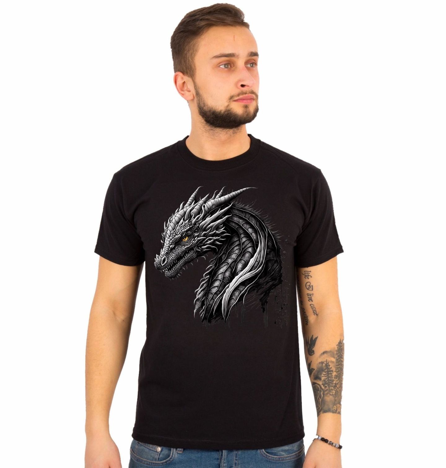 Pánské tričko Prokletý Černý Drak. Tento detailně zpracovaný drak vyzařuje syrovou sílu, nebezpečí a pradávnou moudrost. Ostré šupiny, pronikavý pohled a temná silueta vytvářejí atmosféru světa, kde vládne magie, chaos a dávné legendy. Motiv je inspirován klasickým žánrem fantasy, ve kterém draci představují vrchol moci a respektu.