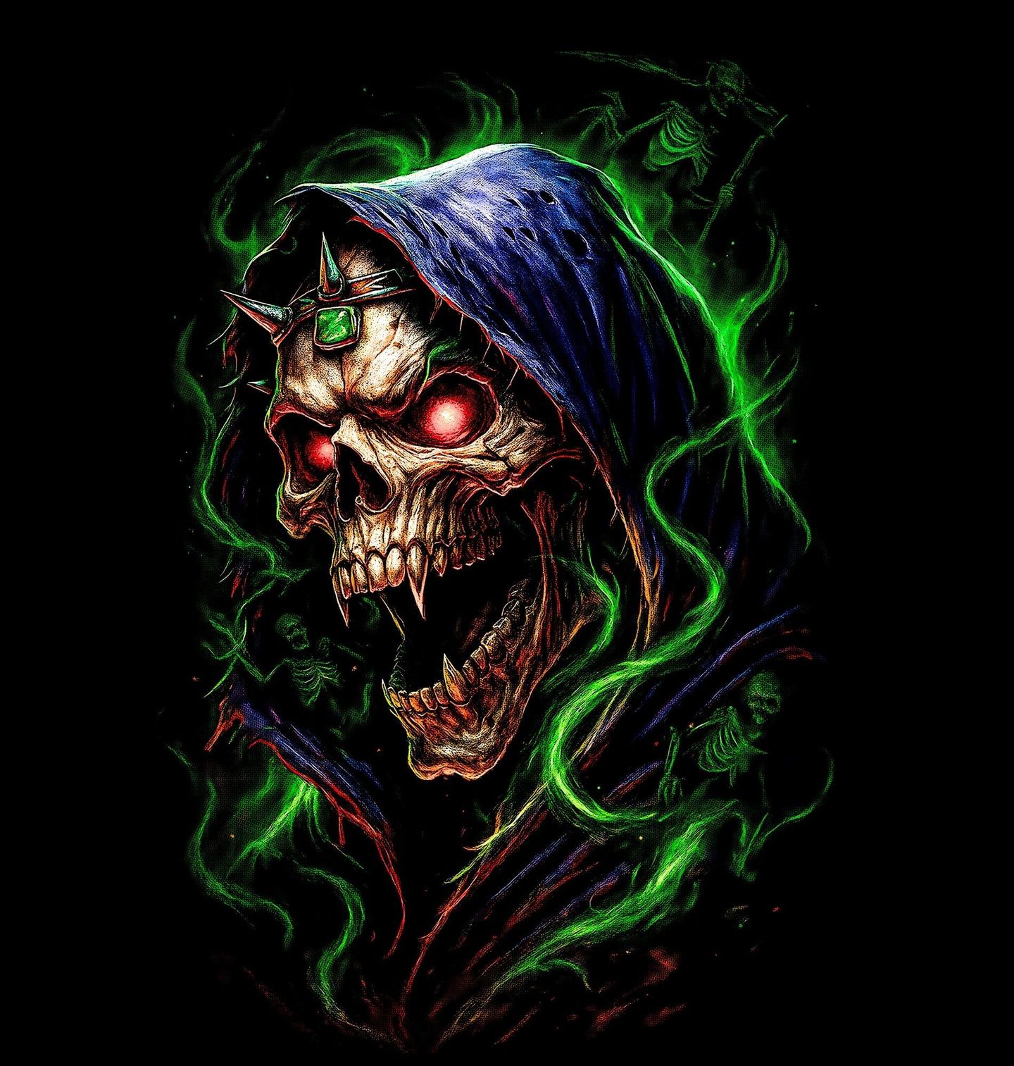 Pánské tričko Prokletý Mág. Tajemný a děsivý motiv, který evokuje sílu zakázané magie. Dominantní lebka vystupuje z temnoty jako kostlivec v roli temného mága, jehož energie prostupuje celou scénou. Zelená aura a přízračné postavy v pozadí vytvářejí dojem, že tento čaroděj ovládá síly smrti a podsvětí. Detailní zpracování, zářící oči a dramatická kompozice z něj dělají ideální volbu pro milovníky fantasy, hororu a mystiky.