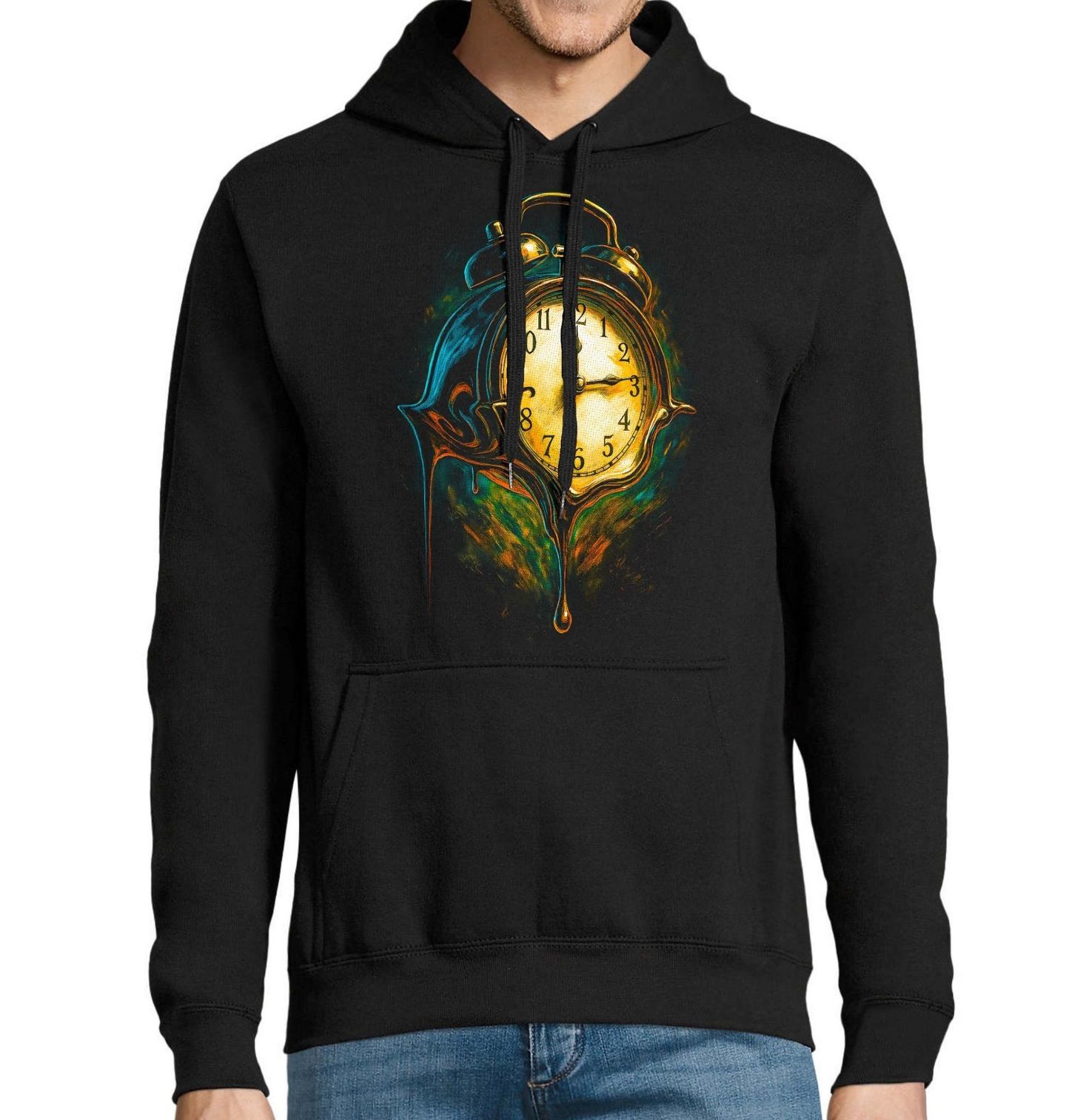 Pánská mikina Promarněný Čas. Originální a surrealistický motiv zachycuje deformované hodiny, které se rozpouštějí pod tlakem neúprosného čas. Tento design symbolizuje pomíjivost okamžiků, chaos reality a fakt, že čas nikdy nezastavíš. Detailní zpracování starých budíkových hodiny v kombinaci s tekoucím efektem vytváří silný vizuální dojem inspirovaný surrealismem.