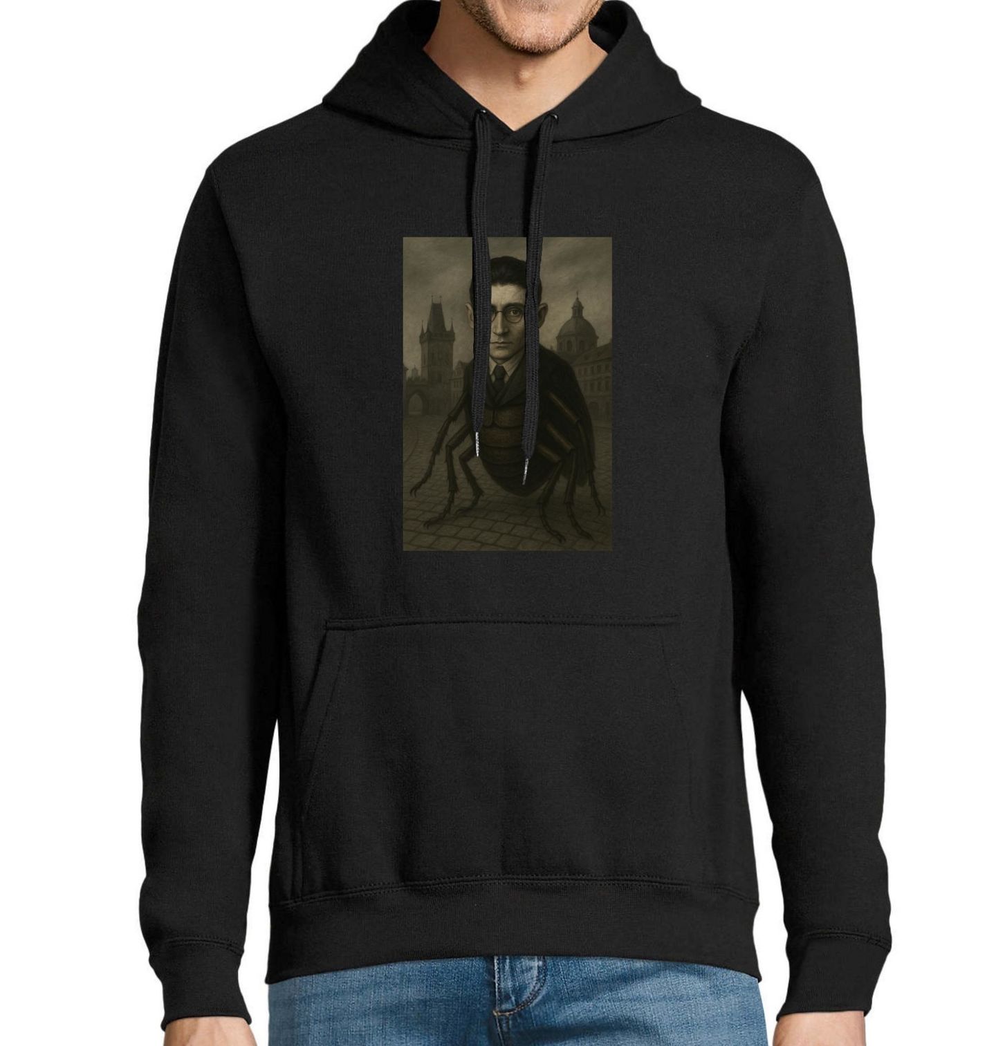 Pánská mikina Proměna Franze Kafky The Metamorphosis. Franz Kafka, autor slavné novely Proměna, se na tomto tričku zhmotňuje v děsivě fascinující podobě člověka proměněného v hmyz. Silueta Prahy v pozadí a tělo brouka v saku vytváří silný vizuální odkaz na kafkovský svět plný absurdity, osamění a vnitřních proměn. Ideální pro fanoušky literatury, a existencialismu.