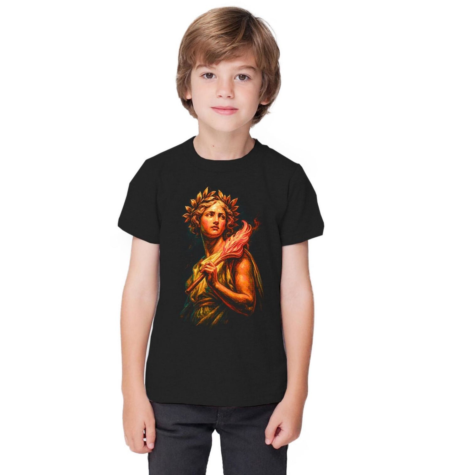 Dětské tričko Prométheus Oheň Poznání. Prométheus je symbolem vzdoru proti autoritě, oběti pro lidstvo a touhy po vědění. V řecké mytologii ukradl bohům oheň a předal jej lidem, čímž jim umožnil rozvoj civilizace. Tento design tak představuje sílu myšlenky, svobody a nezávislosti. Ideální volba pro milovníky mytologie, historie, filozofie i umění.