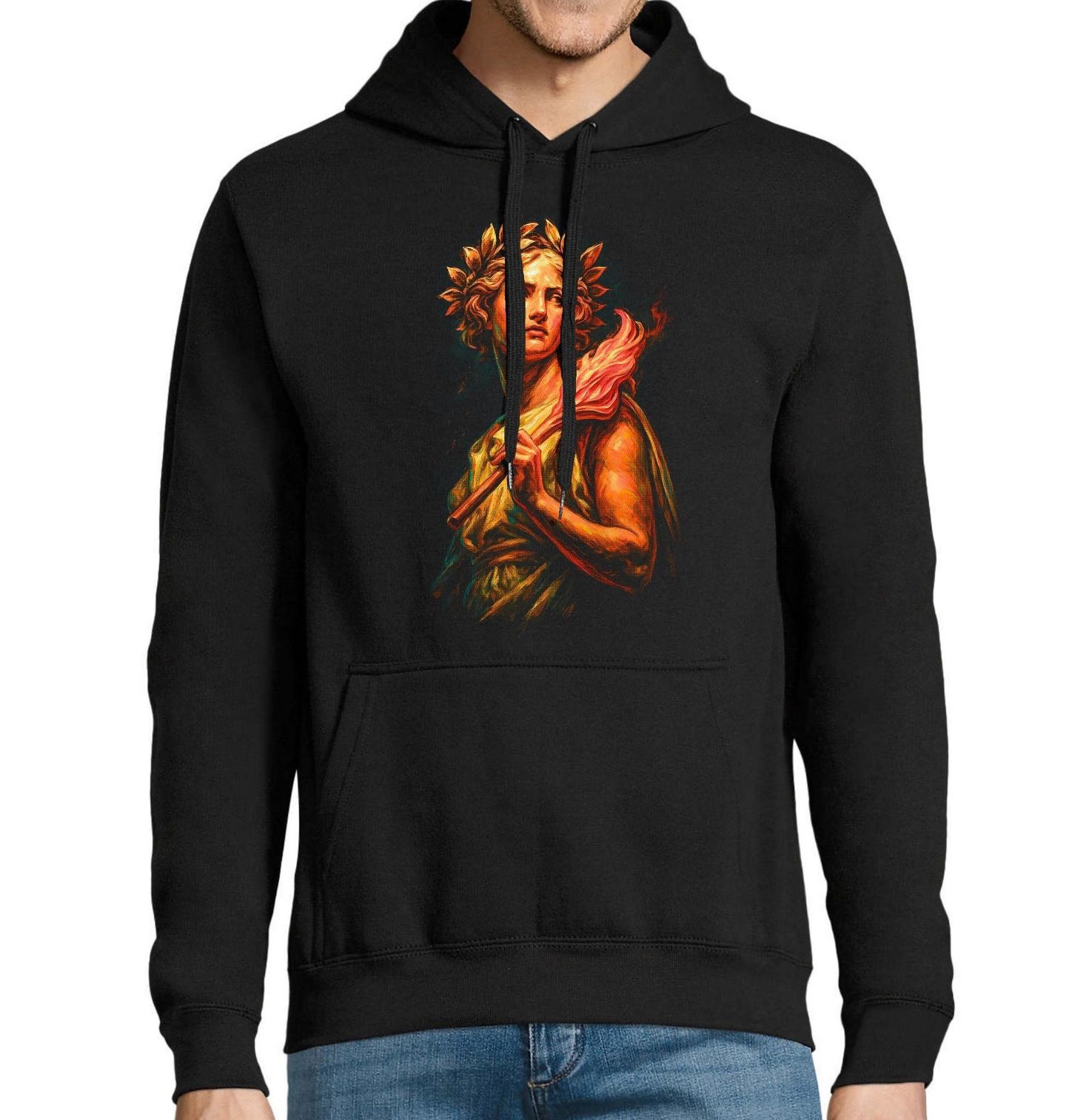 Pánská mikina Prométheus Oheň Poznání. Prométheus je symbolem vzdoru proti autoritě, oběti pro lidstvo a touhy po vědění. V řecké mytologii ukradl bohům oheň a předal jej lidem, čímž jim umožnil rozvoj civilizace. Tento design tak představuje sílu myšlenky, svobody a nezávislosti. Ideální volba pro milovníky mytologie, historie, filozofie i umění.
