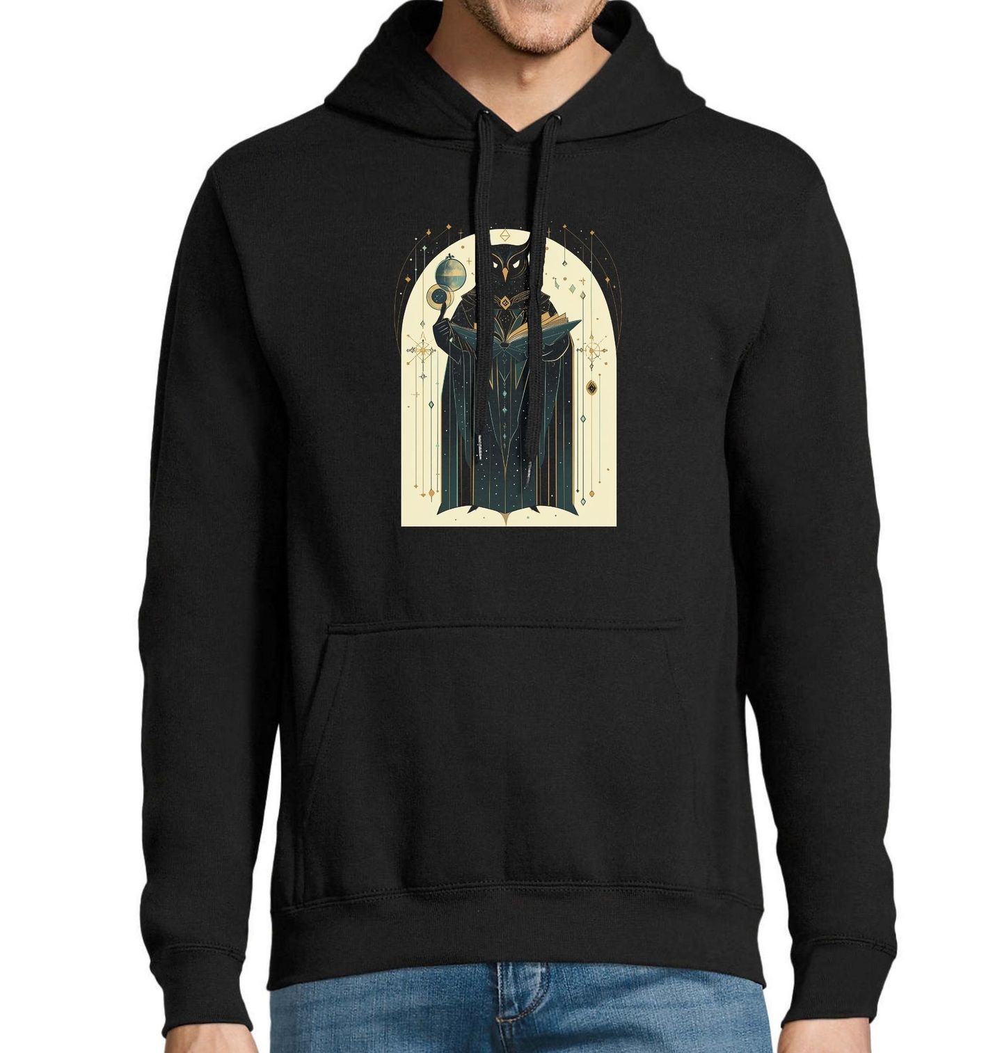 Pánská mikina Proroctví sovího věštce. Na tomto magickém motivu se nachází tajemná sova v podobě vesmírného věštce – moudré bytosti zahalené v temném plášti posetém hvězdami. V jedné ruce drží planetární model, v druhé otevřenou knihu osudu. Obklopena symboly alchymie a vesmíru, zosobňuje věštec sova pradávné vědění, moudrost a sílu poznání.