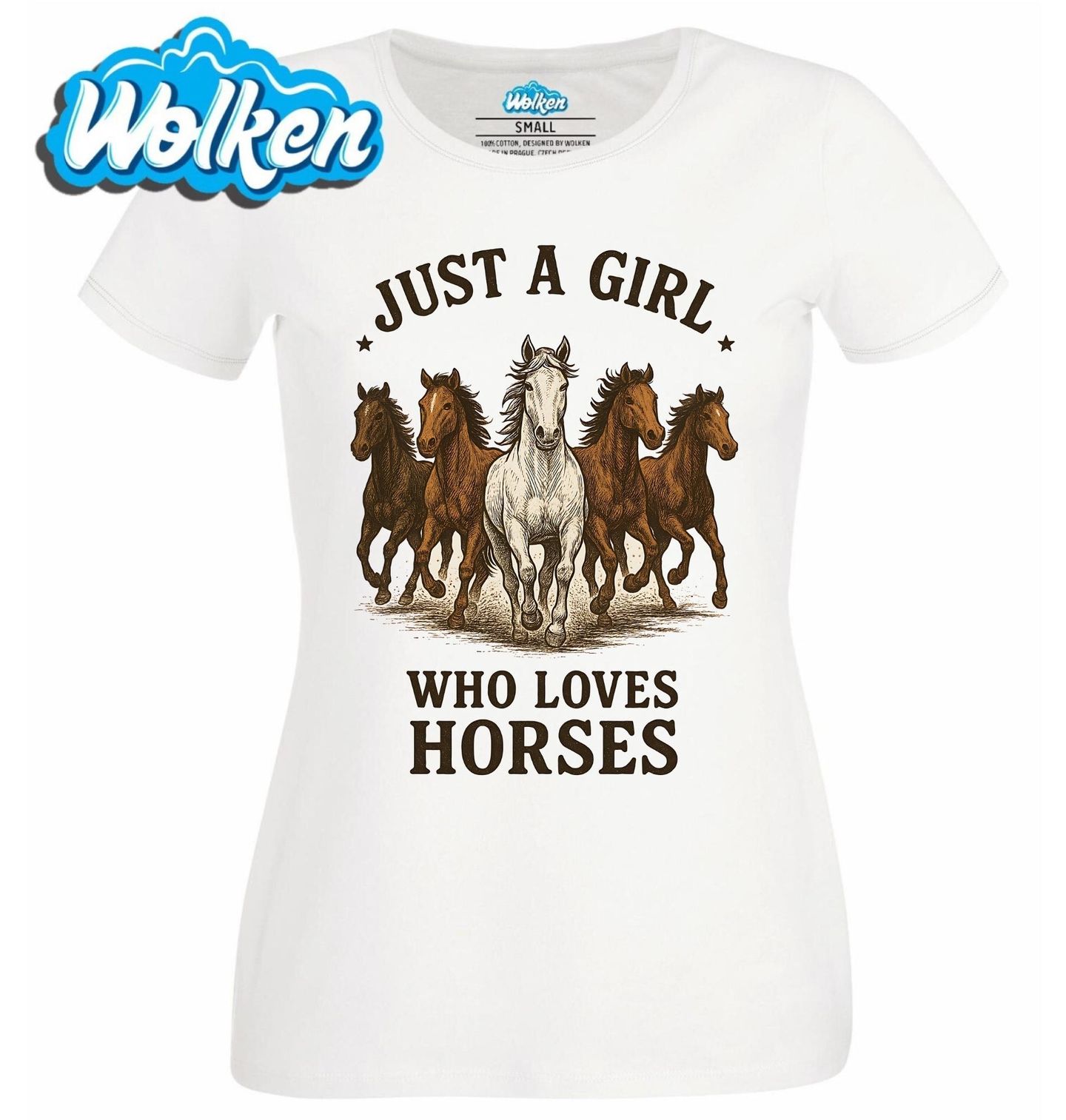 Dámské tričko Prostě holka, která miluje koně. „Just a girl who loves horses“ je ideální pro každého milovníka svobody, přírody a věrného zvířecího přítele. Tento design s běžícím stádem koní v čele s výrazným bílým koněm je skvělou volbou pro každého, kdo má rád kůň a westernový či venkovský styl.