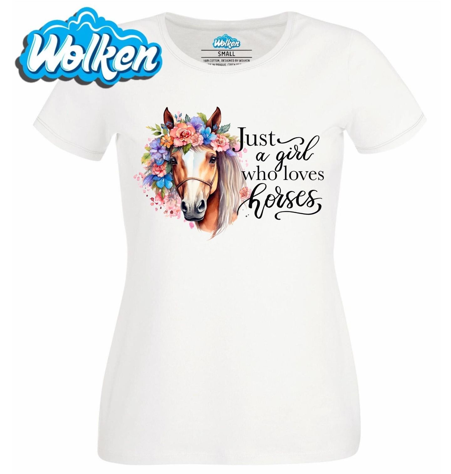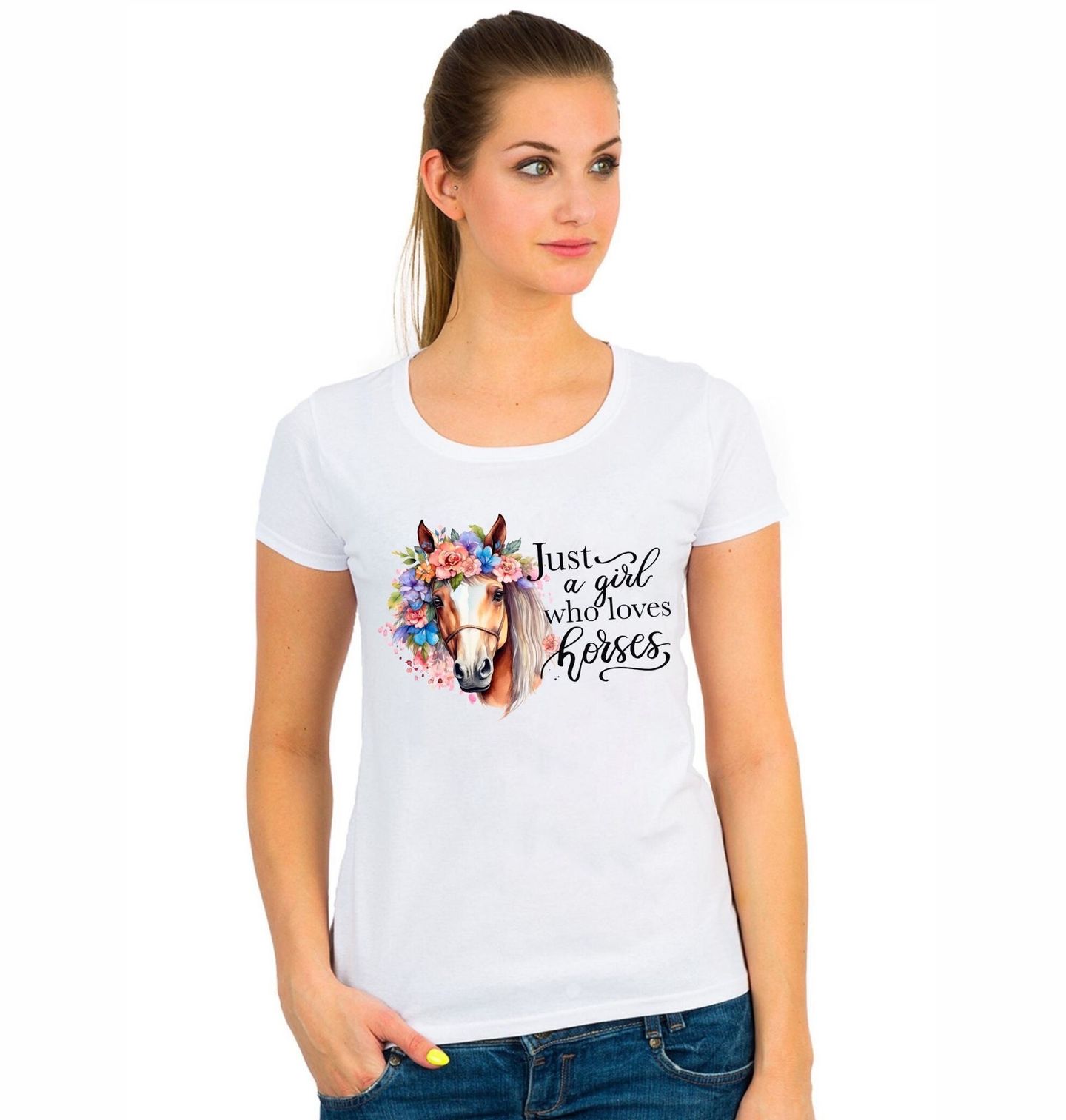 Dámské tričko Prostě holka, která miluje koně Just a girl who loves horses. Na motivu je krásně ilustrovaný kůň s jemným výrazem a květinovým věncem na hlavě. Romantický motiv s koněm obklopeným barevnými květy je jako stvořený pro všechny milovnice koní. Jemná kombinace přírody a elegance udělá radost každé duši spojené s přírodou a láskou ke zvířatům.