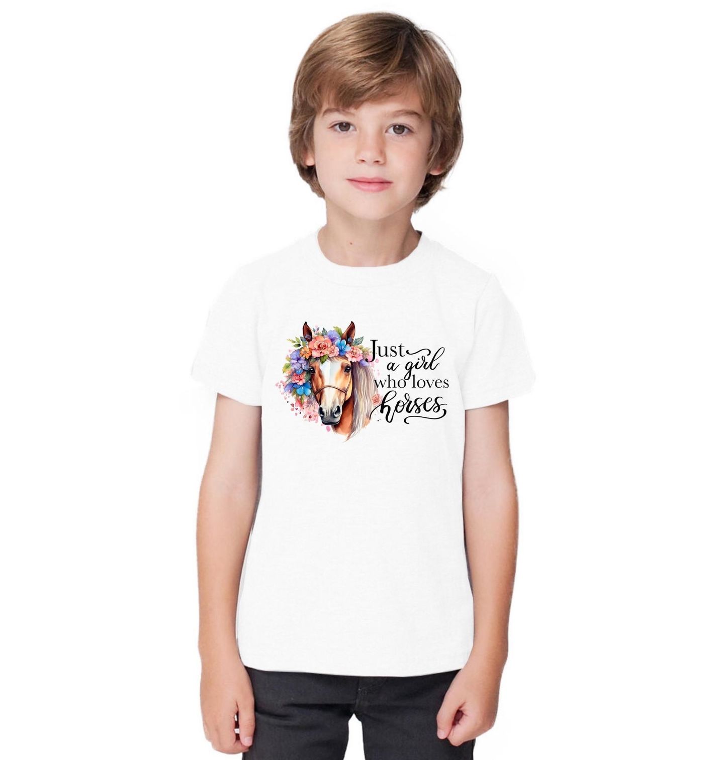 Dětské tričko Prostě holka, která miluje koně Just a girl who loves horses. Na motivu je krásně ilustrovaný kůň s jemným výrazem a květinovým věncem na hlavě. Romantický motiv s koněm obklopeným barevnými květy je jako stvořený pro všechny milovnice koní. Jemná kombinace přírody a elegance udělá radost každé duši spojené s přírodou a láskou ke zvířatům.