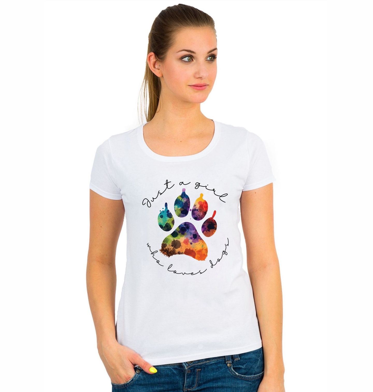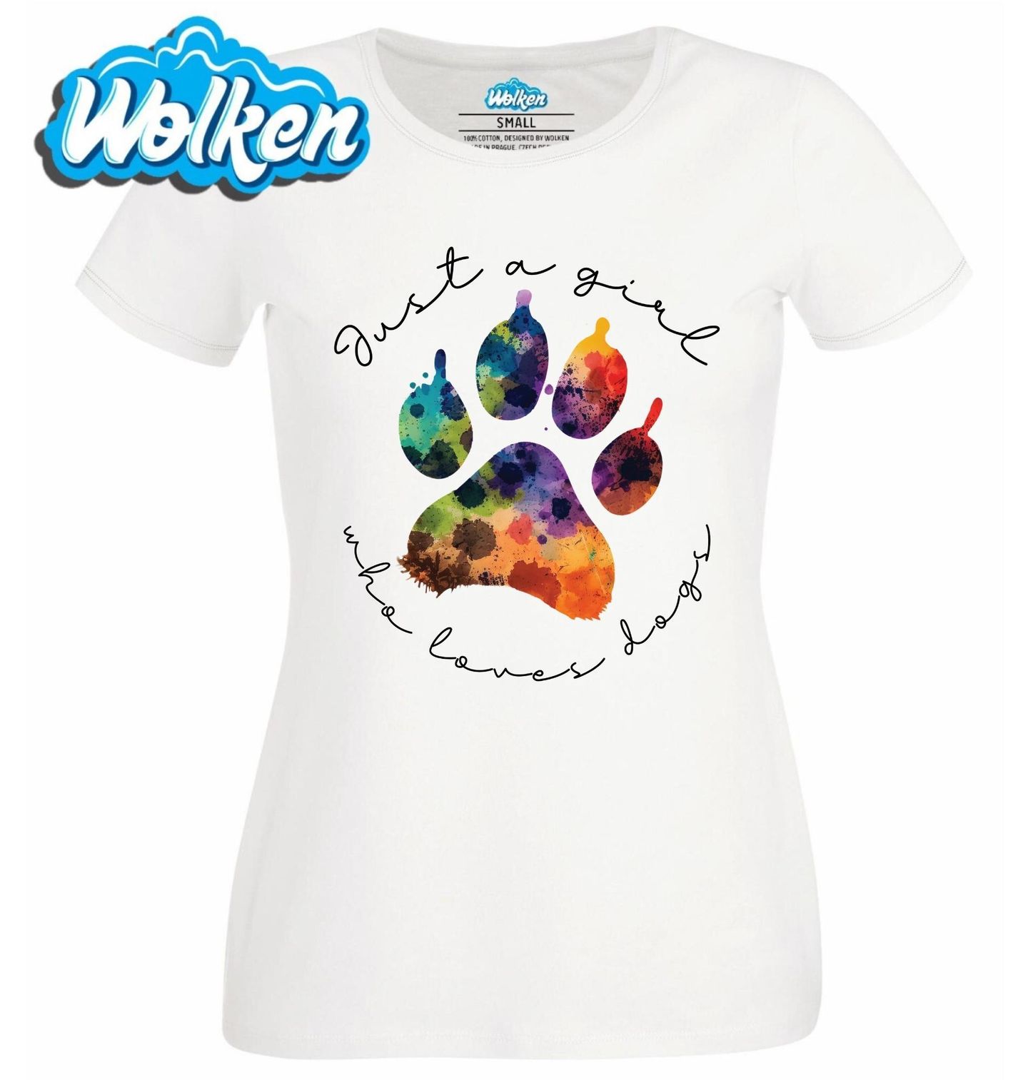 Dámské tričko Prostě holka, která miluje psy. Tento barevný motiv s nápisem „Just a girl who loves dogs“ je dokonalým vyjádřením lásky ke čtyřnohým chlupáčům. Duha barev v tlapce symbolizuje radost, kterou pes do života přináší. Motiv je ideální pro každou hrdou pejskařku, která chce ukázat, že její srdce bije pro tlapky.