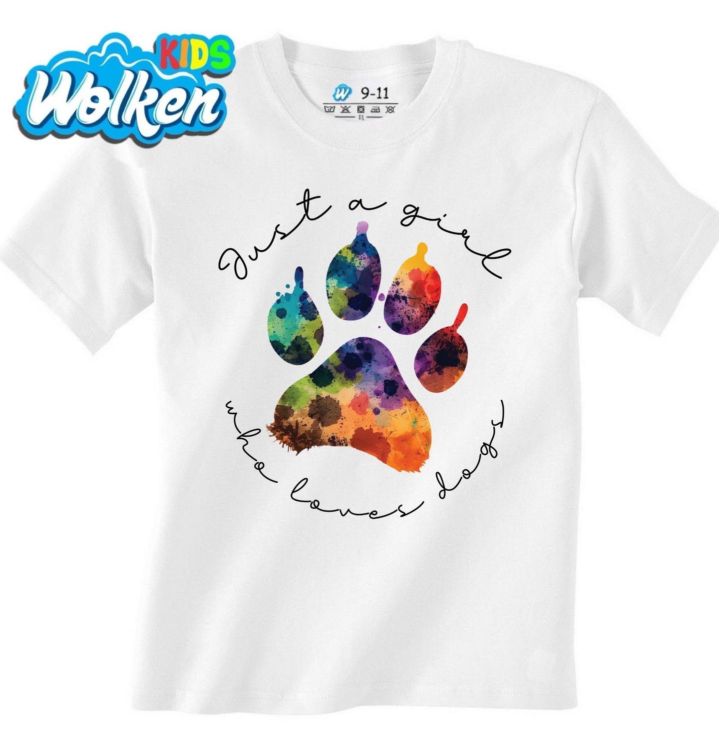 Dětské tričko Prostě holka, která miluje psy. Tento barevný motiv s nápisem „Just a girl who loves dogs“ je dokonalým vyjádřením lásky ke čtyřnohým chlupáčům. Duha barev v tlapce symbolizuje radost, kterou pes do života přináší. Motiv je ideální pro každou hrdou pejskařku, která chce ukázat, že její srdce bije pro tlapky.