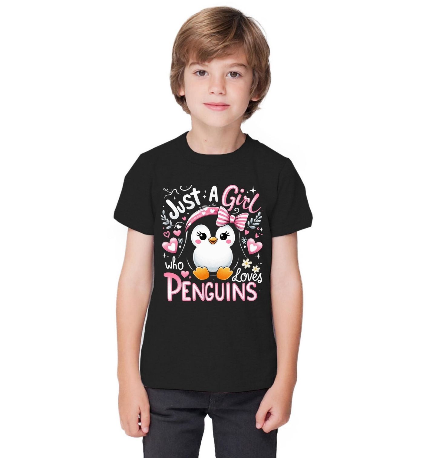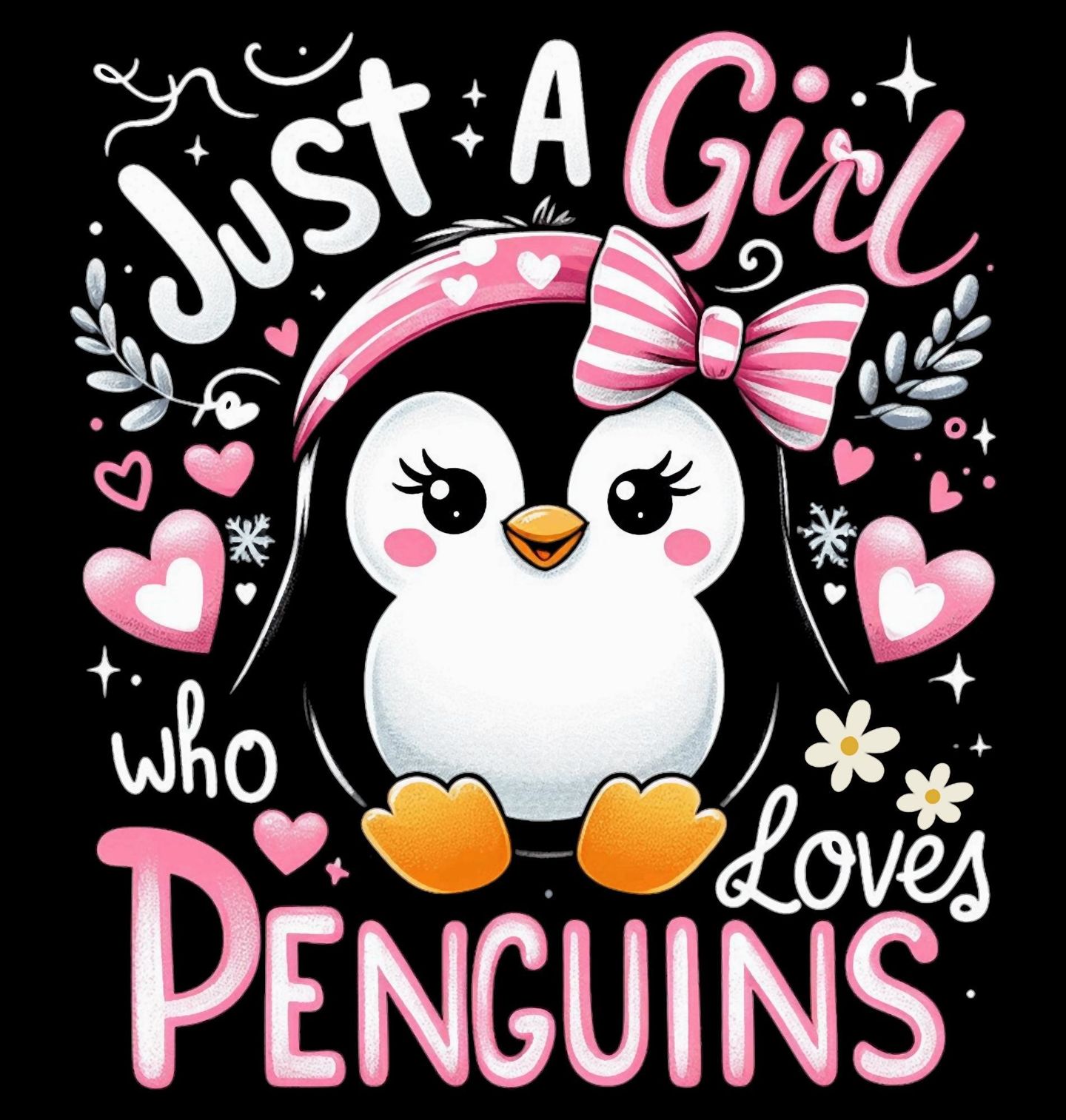 Dětské tričko Prostě holka, která miluje tučňáky. „Just a girl who loves penguins“ s usměvavým tučňákem v růžové čelence potěší každou milovnici těchto ledových mazlíčků. Nápis je doplněn srdíčky, kvítky a jemnými detaily – skvělá volba pro každou milovnici roztomilého designu.