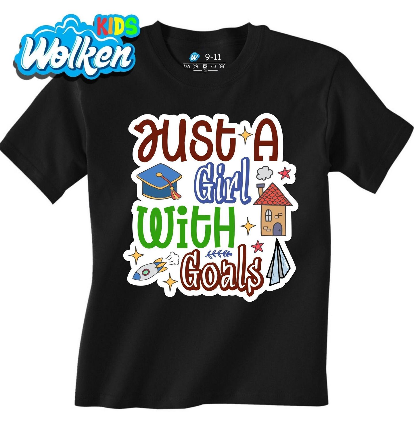 Dětské tričko Prostě holka s cíli Just a girl with goals. Stylový motiv je jako stvořený pro každou slečnu, která má své cíle, sny a ambice. Design obsahuje barevné symboly cílů jako raketu (sny), promoční čepici (vzdělání), dům, hvězdy a papírovou vlaštovku (kreativita). Tento motiv je skvělou volbou pro všechny ženy a dívky, které si jdou za svým.