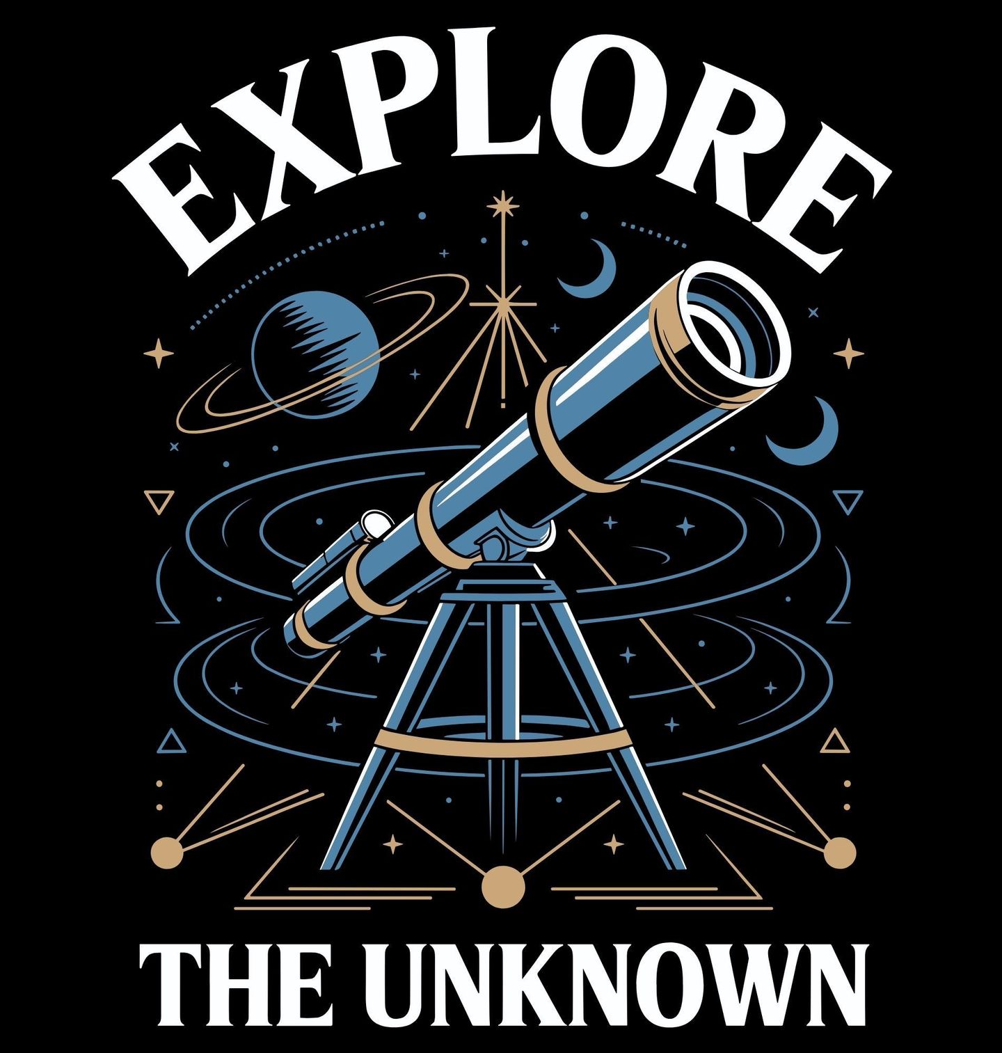 Dámské tričko Prozkoumej Neznámé Explore The Unknown. Originální motiv s ilustrací hvězdářského dalekohledu a kosmických prvků vyzývá k objevování a poznávání. Vesmír zde symbolizuje nekonečné možnosti, tajemství a dobrodružství, která čekají za hranicí známého světa. Design je ideální pro všechny, které fascinuje vesmír, astronomie, planety a hvězdy.