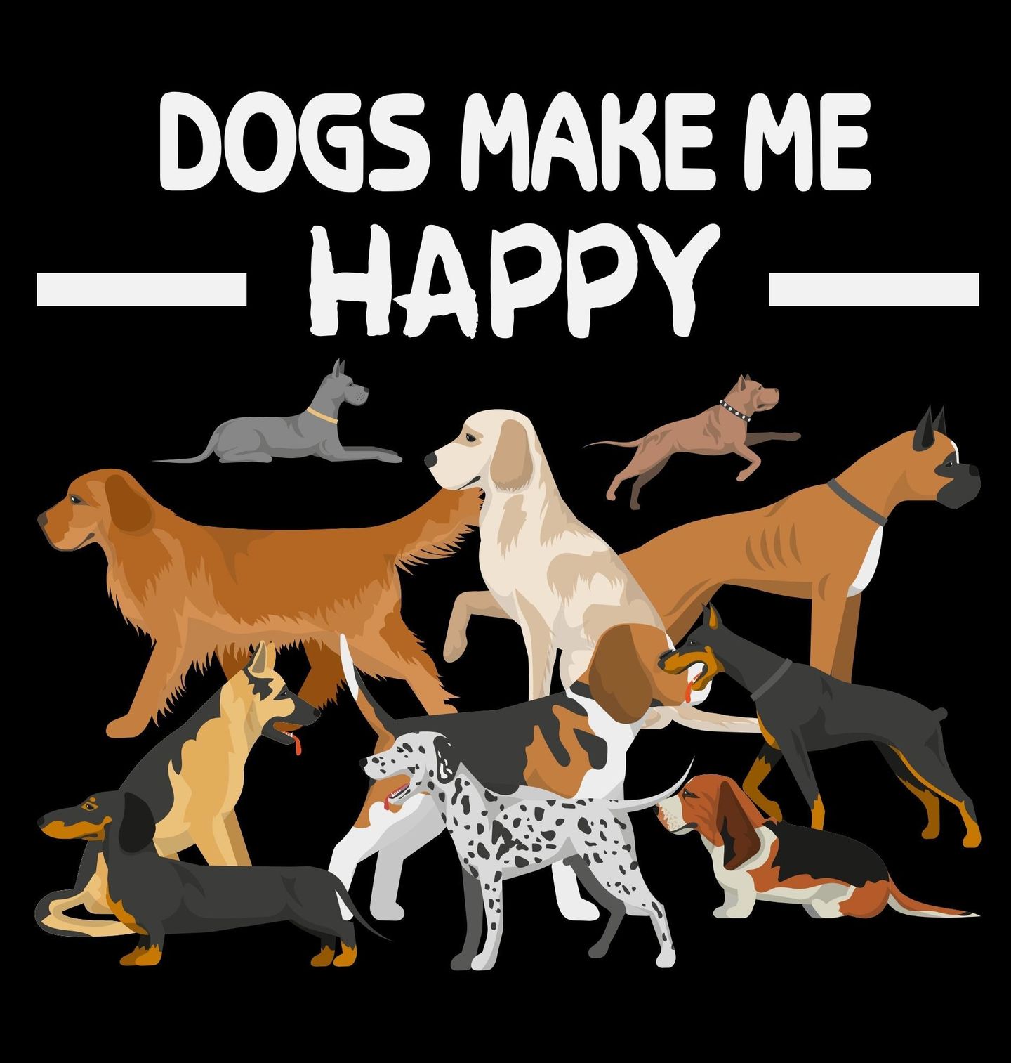 Dámské tričko Psi mě dělají šťastným. “DOGS MAKE ME HAPPY”. Na motivu jsou vyobrazeny oblíbené psí rasy: zlatý retrívr, labradorský retrívr, německý ovčák, dalmatin, jezevčík, dobrman, boxer, bígl, vipet (chrt), stafordšírský teriér. Rozmanitost plemen symbolizuje, že radost a lásku může přinést každý pes, bez ohledu na velikost nebo povahu – přesně to, co cítí každý skutečný pejskař.