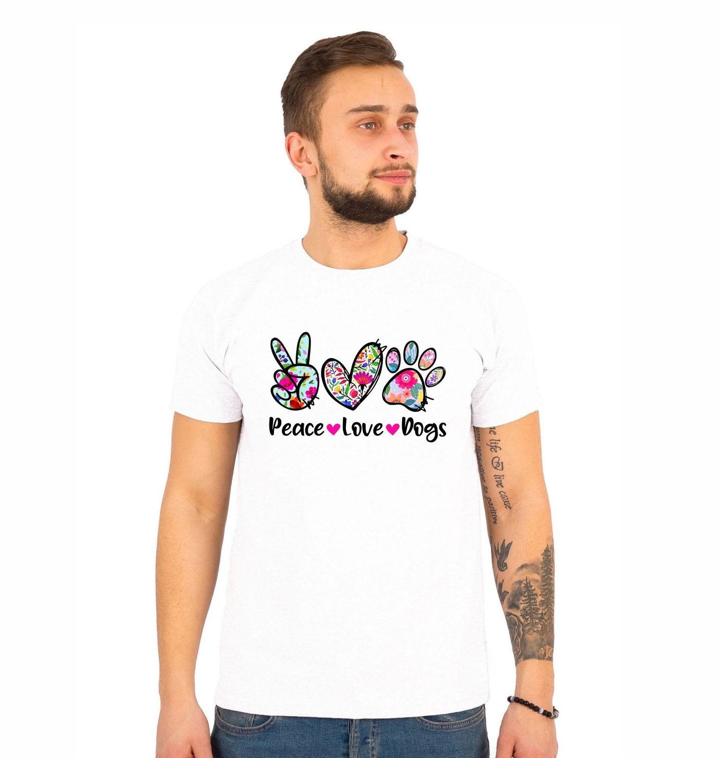 Pánské tričko Psí Mír a Láska Peace Love Dogs. Tento veselý a barevný motiv spojuje to nejdůležitější pro každého milovníka zvířat – mír, srdce a pes v jednom designu. Květinový znak míru, srdce plné barev a tlapka psa vytvářejí harmonickou trojici, která vystihuje lásku, klid a oddanost, kterou pejskař vnímá každý den.