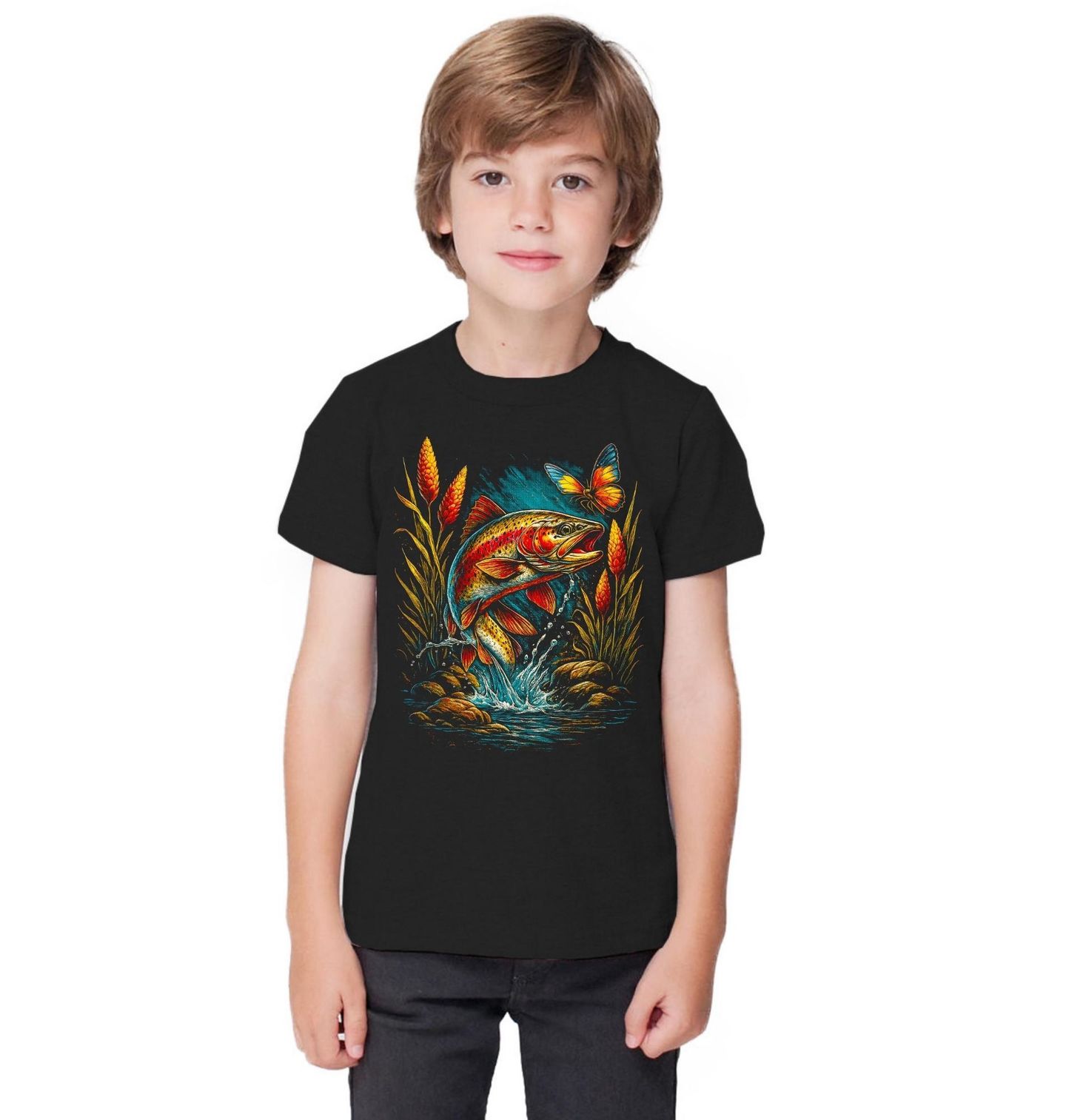 Dětské tričko Pstruh duhový s Motýlem. Tento detailně zpracovaný motiv zachycuje pstruha duhového v dynamickém výskoku nad hladinou řeky. Pstruh duhový je ikonou horských potoků a symbolem lehkosti i síly. Pro každého, kdo miluje rybaření, představuje tento druh ryby opravdový zážitek a respekt k přírodě. Skutečný rybář ví, že lov pstruha není jen o úlovku, ale o klidu, trpělivosti a citu pro vodu.