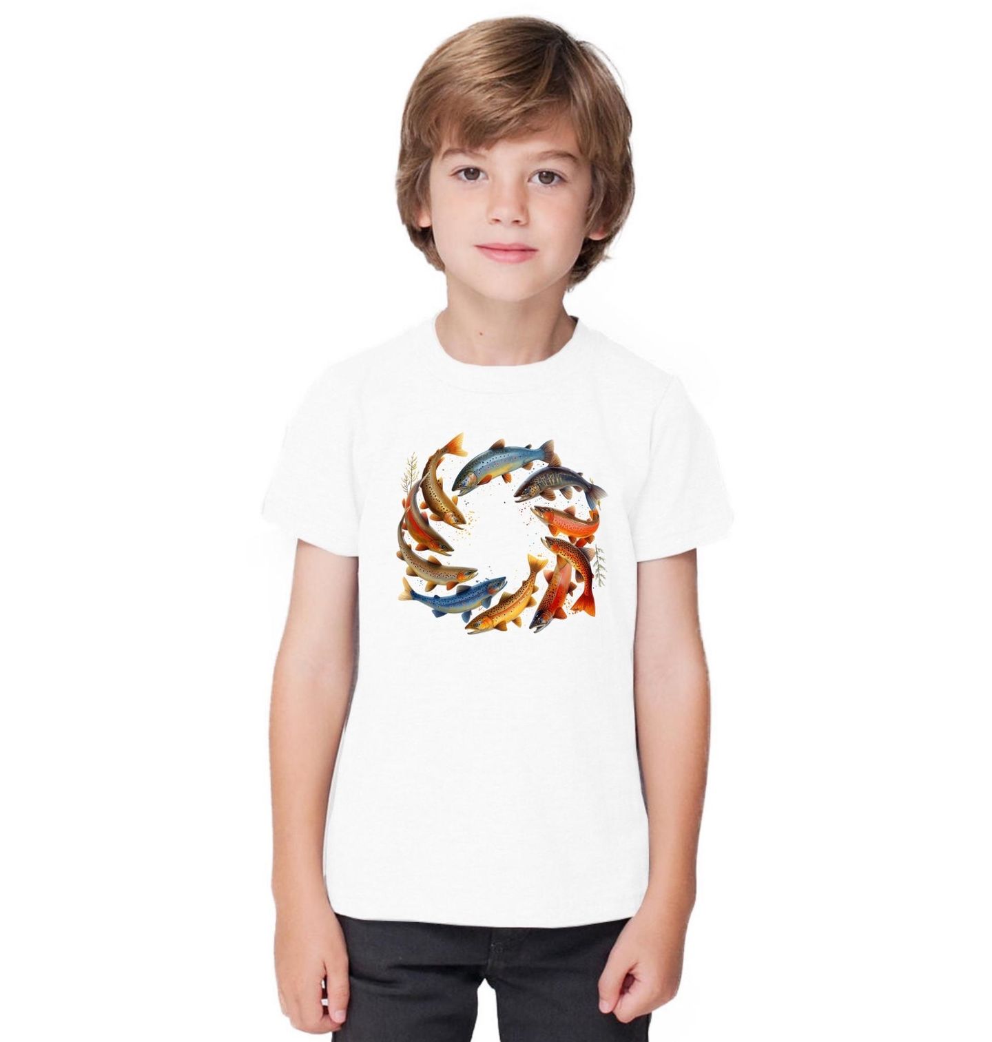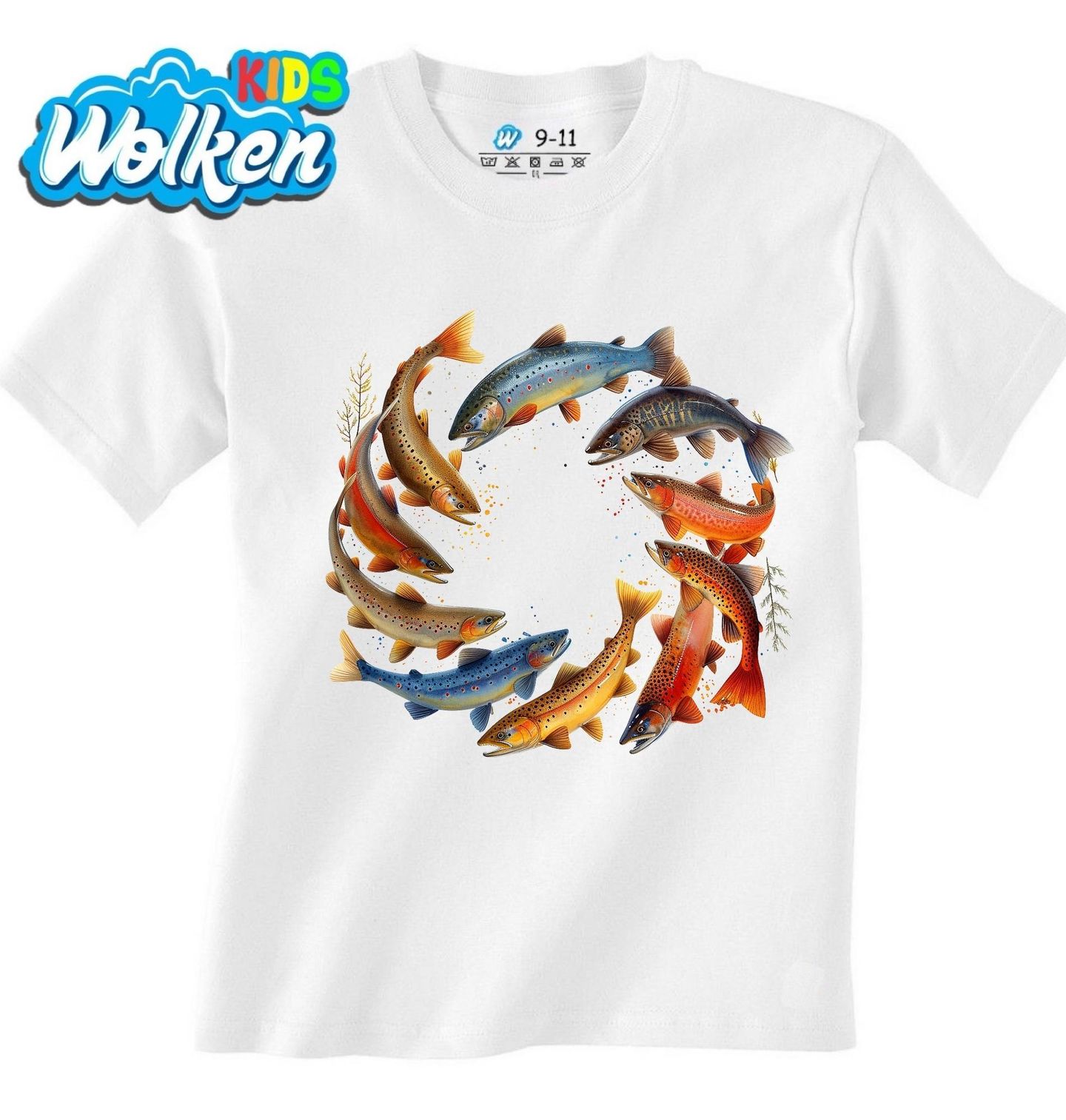 Dětské tričko Pstruzi v kruhu života. Tento originální motiv znázorňuje věnec tvořený různými druhy pstruhů, oblíbenými rybami všech vášnivých rybářů. Každá ryba je detailně vyobrazena v jedinečných barvách, které oslavují krásu přírody i radost z rybaření.