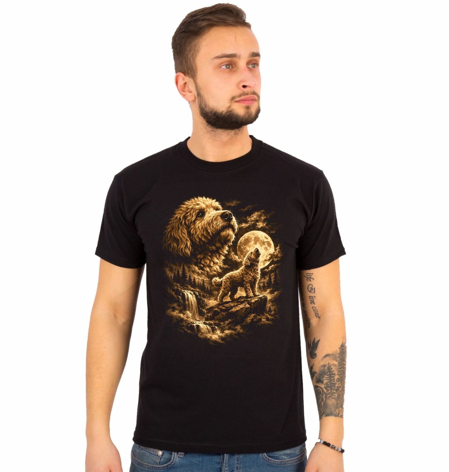 Pánské tričko Pudl a Kouzlo Úplňku. Elegantní pudl zachycený v dramatickém světle úplňku působí vznešeně a téměř magicky. Kombinace detailní kresby srsti a romantické krajiny s vodopádem vytváří harmonický celek. Tento pes design osloví každého, kdo má rád styl, eleganci a kouzlo noční přírody.