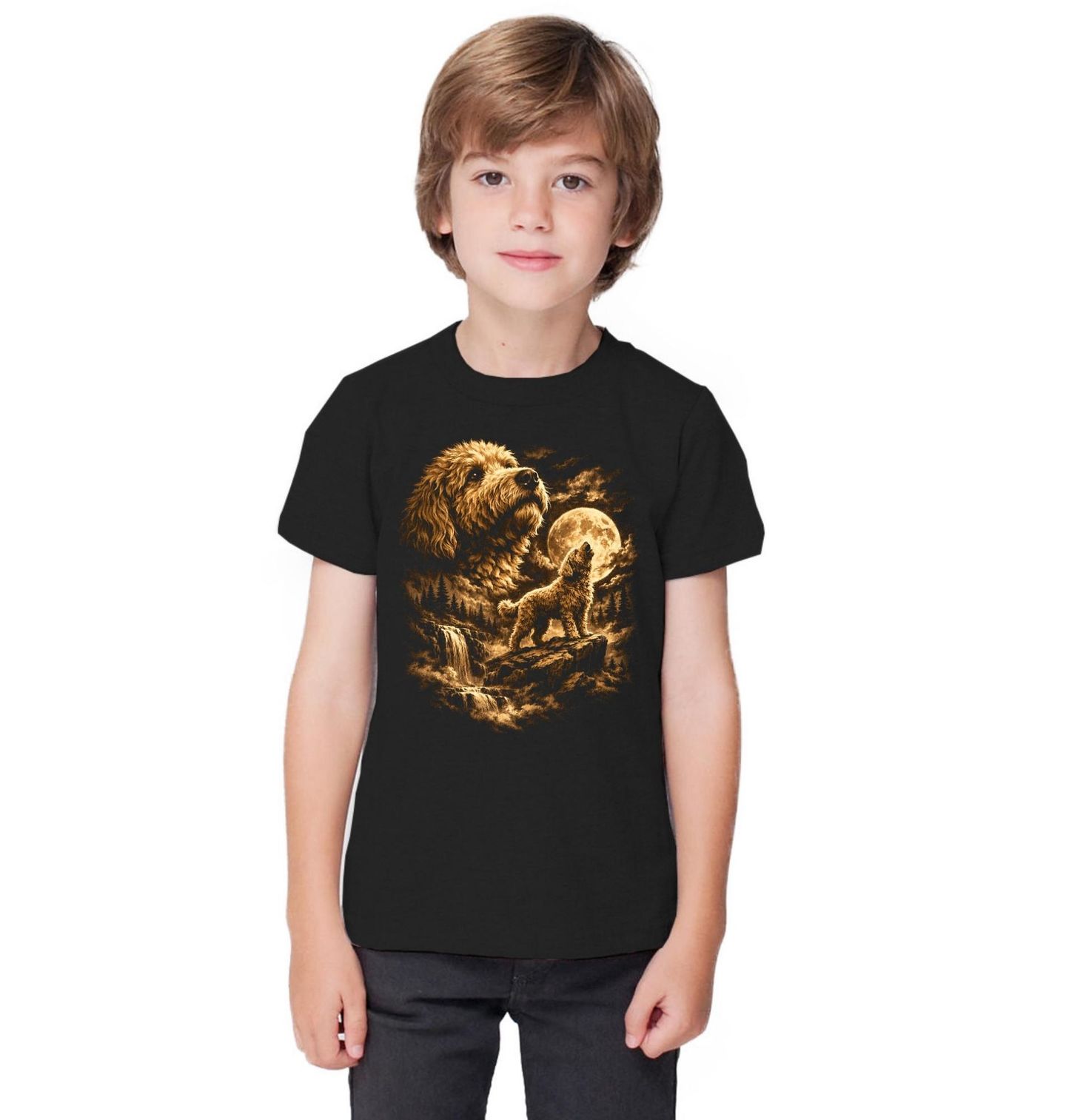 Dětské tričko Pudl a Kouzlo Úplňku. Elegantní pudl zachycený v dramatickém světle úplňku působí vznešeně a téměř magicky. Kombinace detailní kresby srsti a romantické krajiny s vodopádem vytváří harmonický celek. Tento pes design osloví každého, kdo má rád styl, eleganci a kouzlo noční přírody.