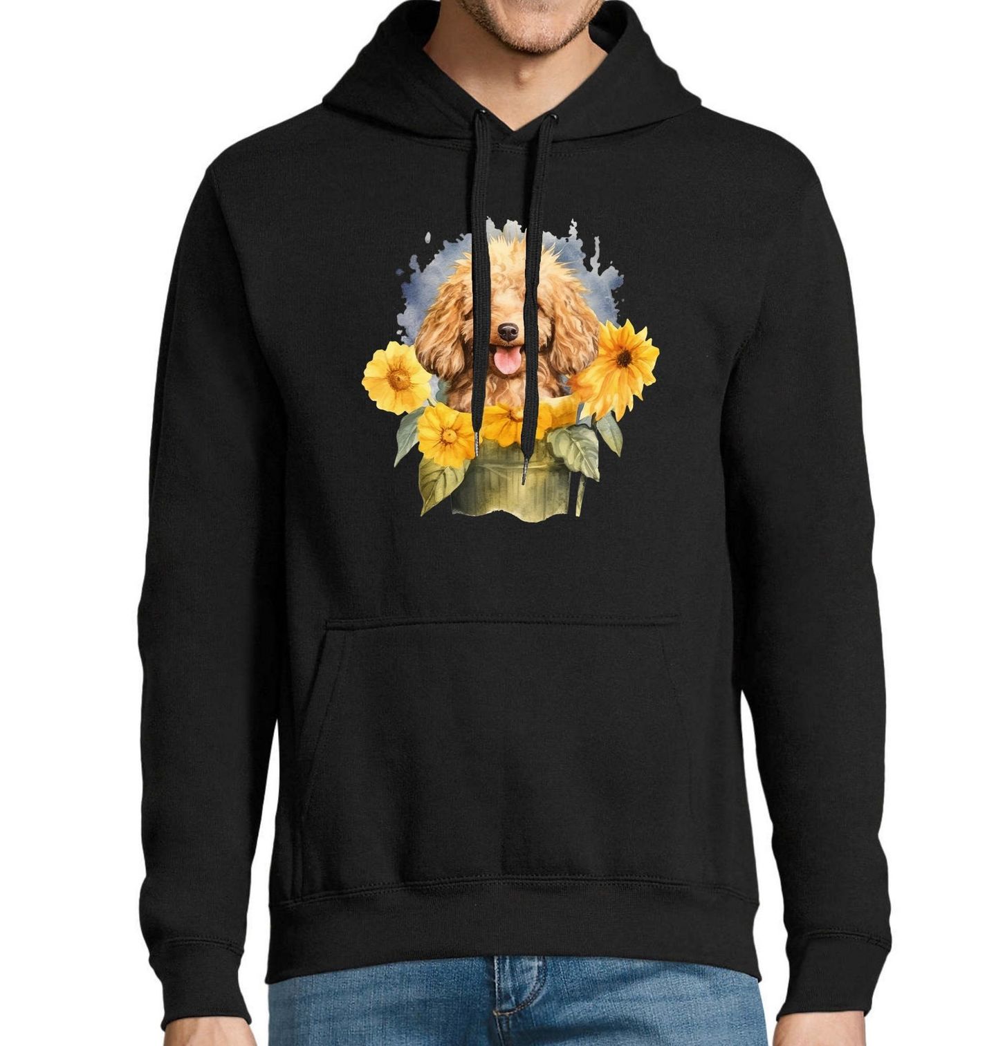 Pánská mikina Pudl v Květináči Slunečnic. Roztomilý pes, přesněji pudl, obklopený zářivými slunečnicemi, je motivem, který pohladí na duši každého pejskaře. Spojení psa a květin působí pozitivně, teple a přináší do každého dne radost. Slunečnice symbolizují energii a štěstí – stejně jako pohled tohoto šťastného chlupáče.