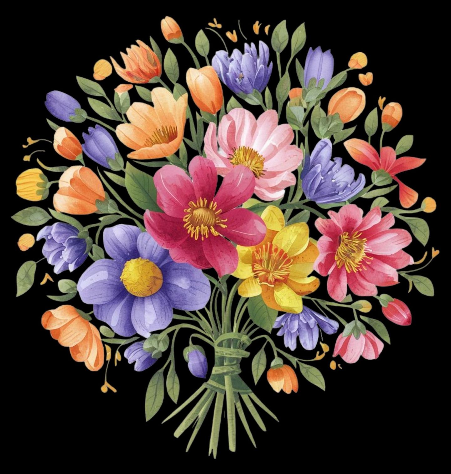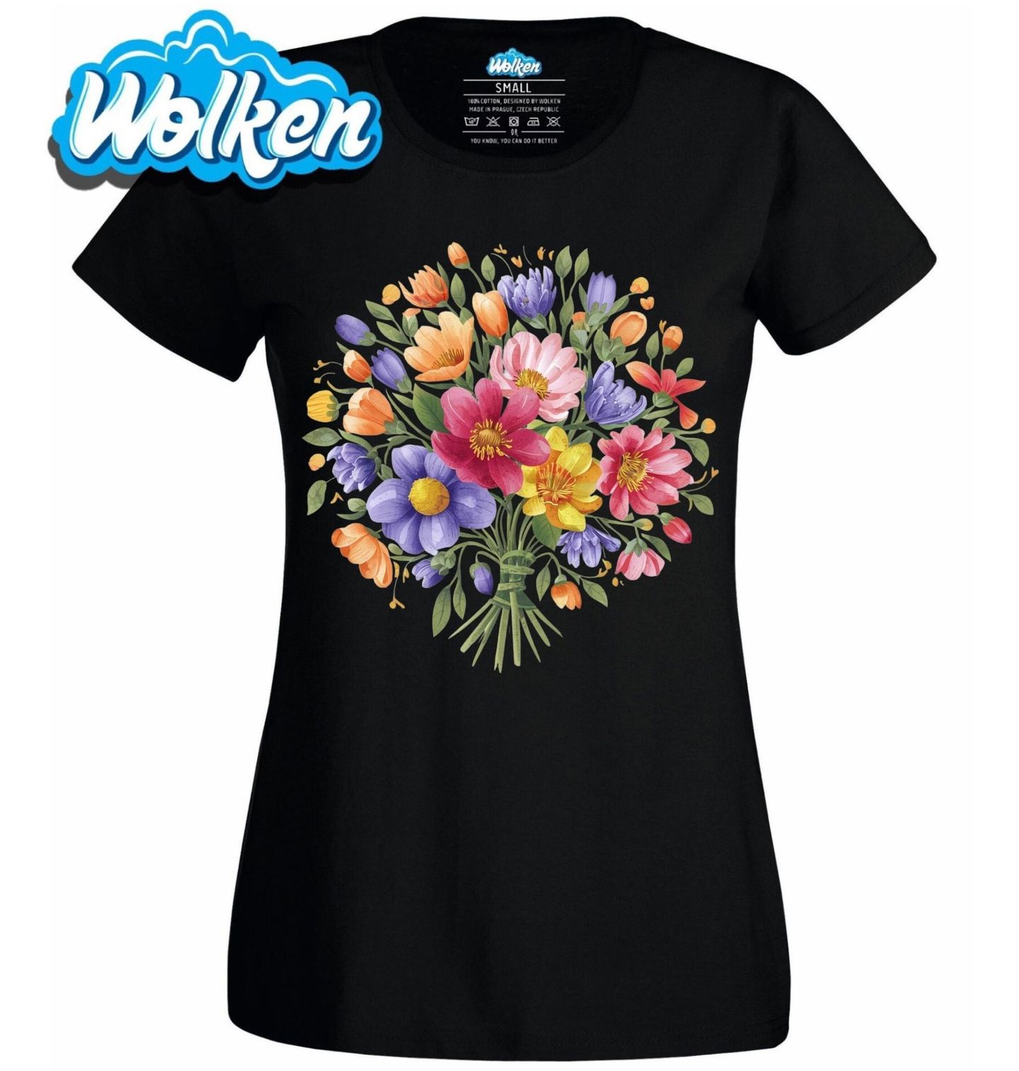 Dámské tričko Pugét Květin. Jemně akvarelovaný pugét pestrých květin rozzáří každý den a skvěle se hodí na tričko, plátěnou tašku nebo plakát. Květiny v plném rozkvětu symbolizují krásu, radost a nové začátky. Motiv je ideální jako dárek pro milovníky přírody, umění nebo romantické duše.