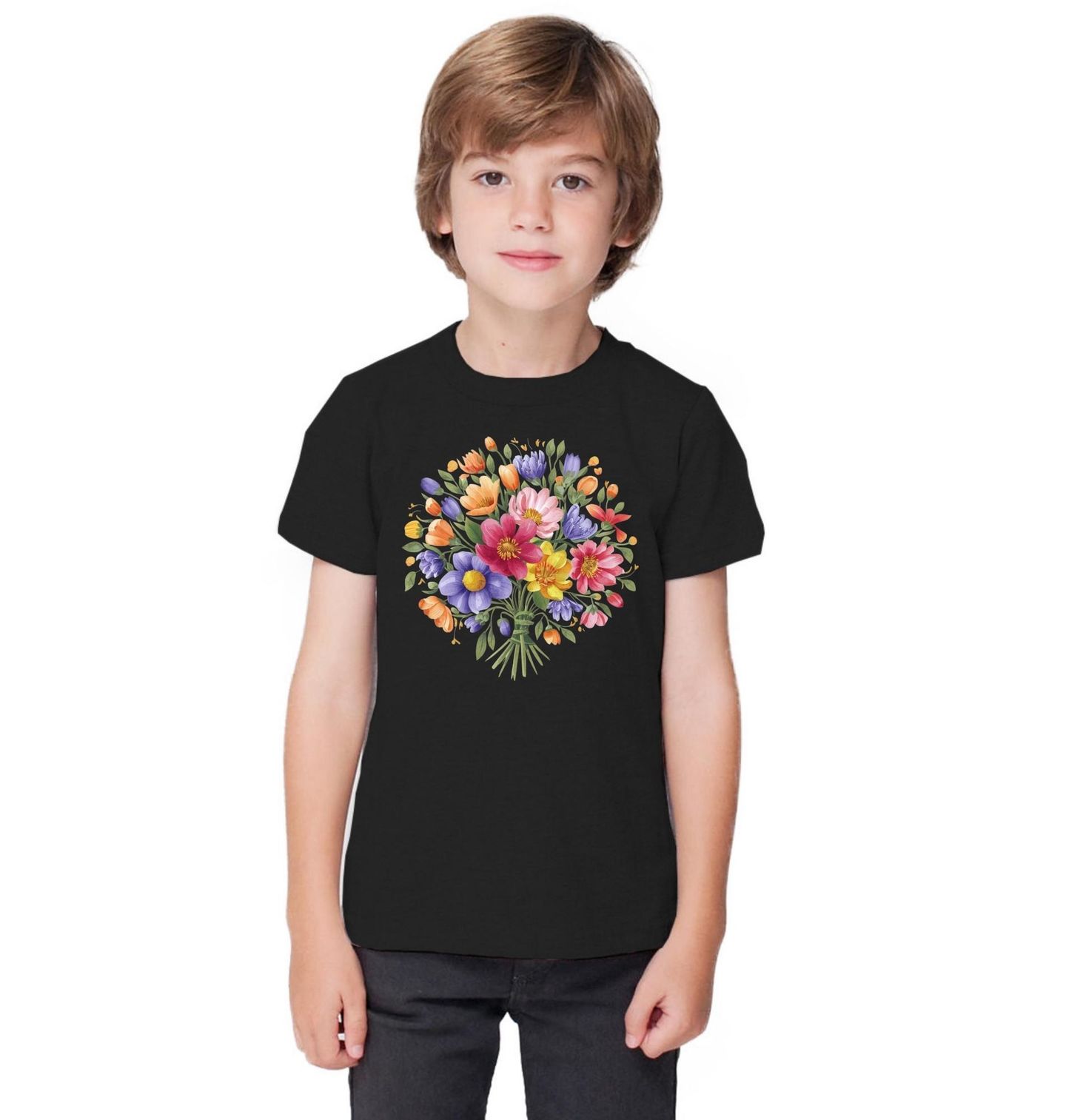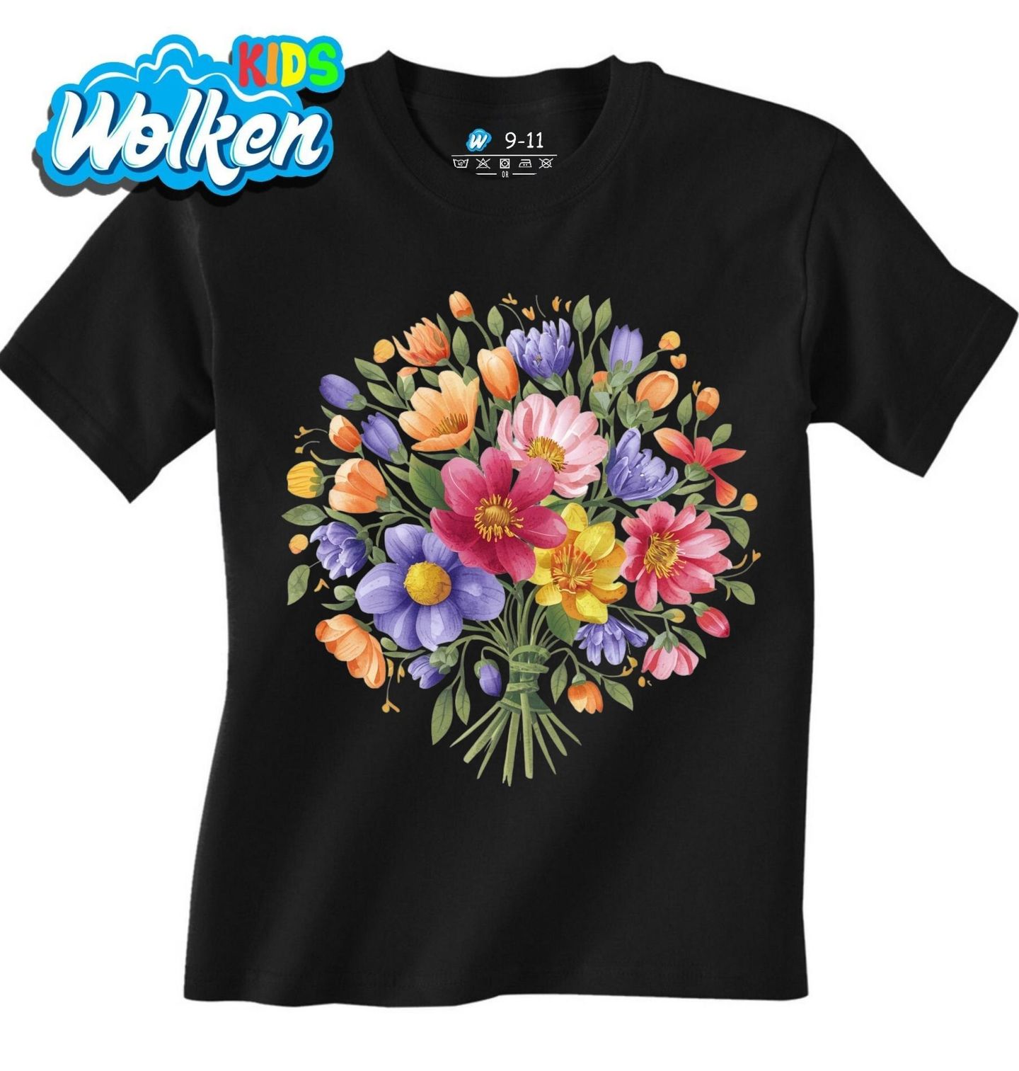 Dětské tričko Pugét Květin. Jemně akvarelovaný pugét pestrých květin rozzáří každý den a skvěle se hodí na tričko, plátěnou tašku nebo plakát. Květiny v plném rozkvětu symbolizují krásu, radost a nové začátky. Motiv je ideální jako dárek pro milovníky přírody, umění nebo romantické duše.