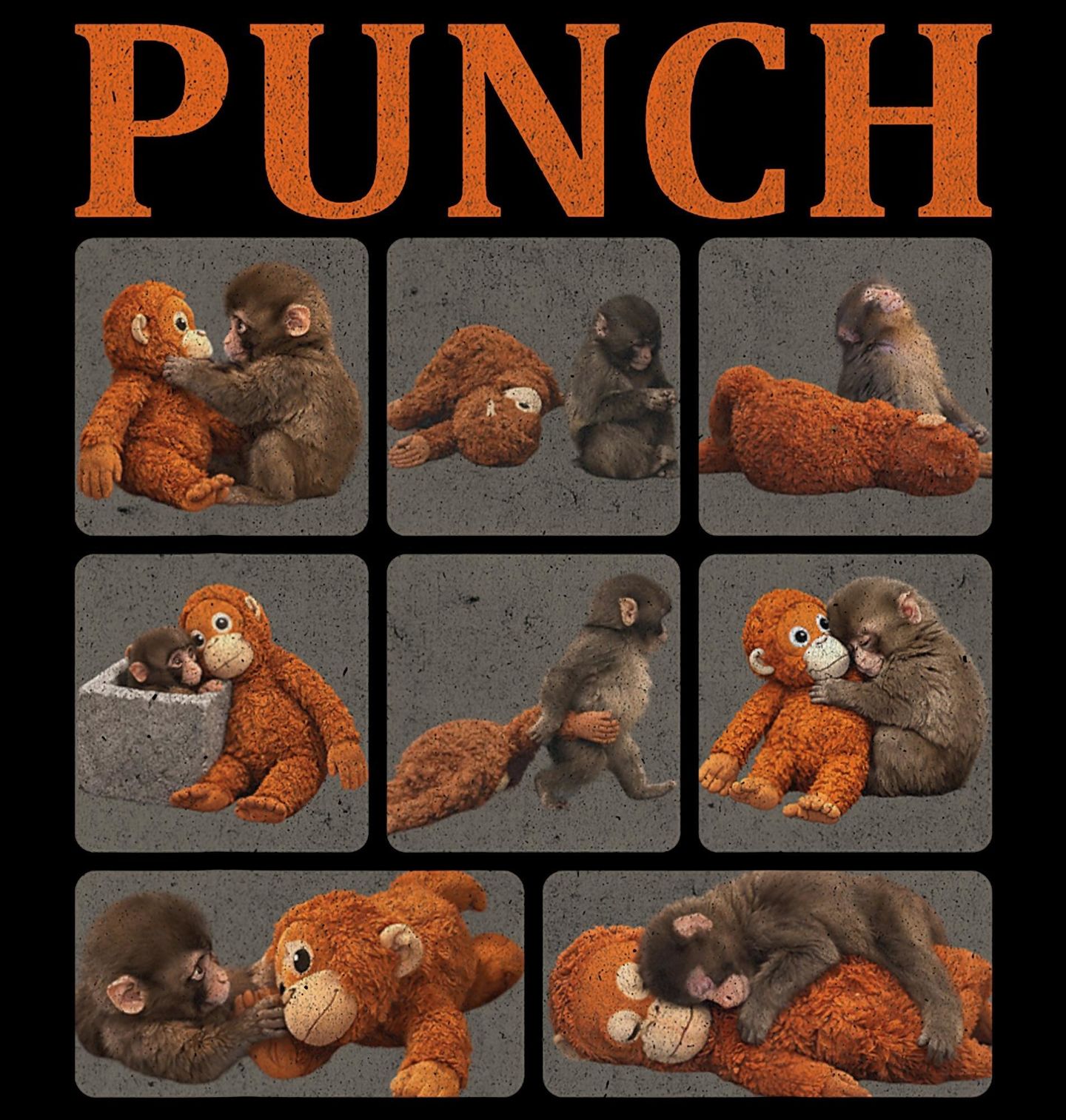 Dětské tričko Punch a jeho Plyšový Kamarád. Tento design zachycuje příběh opičky Punch v sérii silných momentů. Punch je virální opička ze zoo, která byla odmítnuta vlastní matkou, ale našla si vlastní zdroj lásky a bezpečí v plyšovém kamarádovi. Tento design připomíná, že i v těch nejtěžších chvílích může vzniknout silné pouto a naděje.