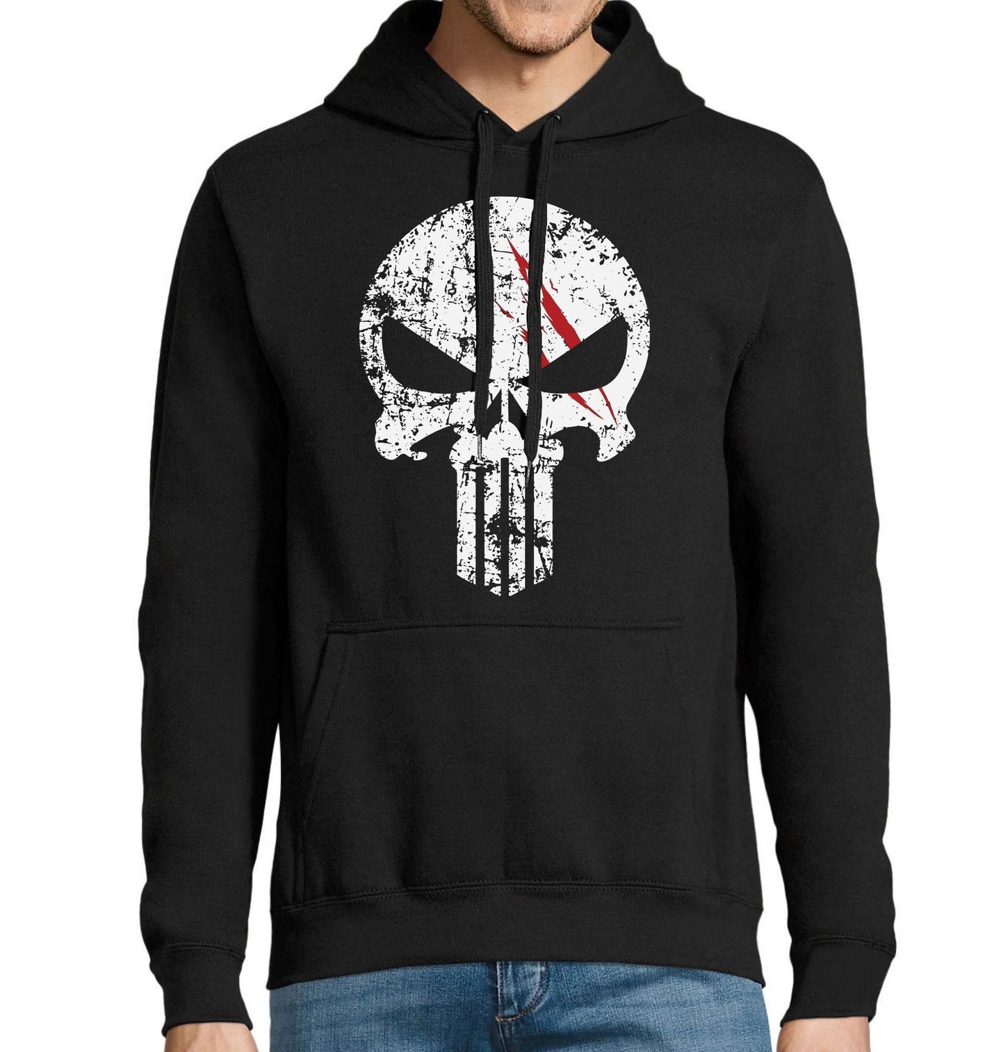 Pánská mikina Punisher Warrior Drsná Lebka s Jizvou. Tato stylová lebka v ikonickém drsném provedení zaujme na první pohled díky kontrastnímu designu a červenému škrábnutí, které dodává motivu agresivní charakter. Lebka symbolizuje sílu, odolnost a neústupnost. Ideální pro fanoušky temné estetiky a rebelství.