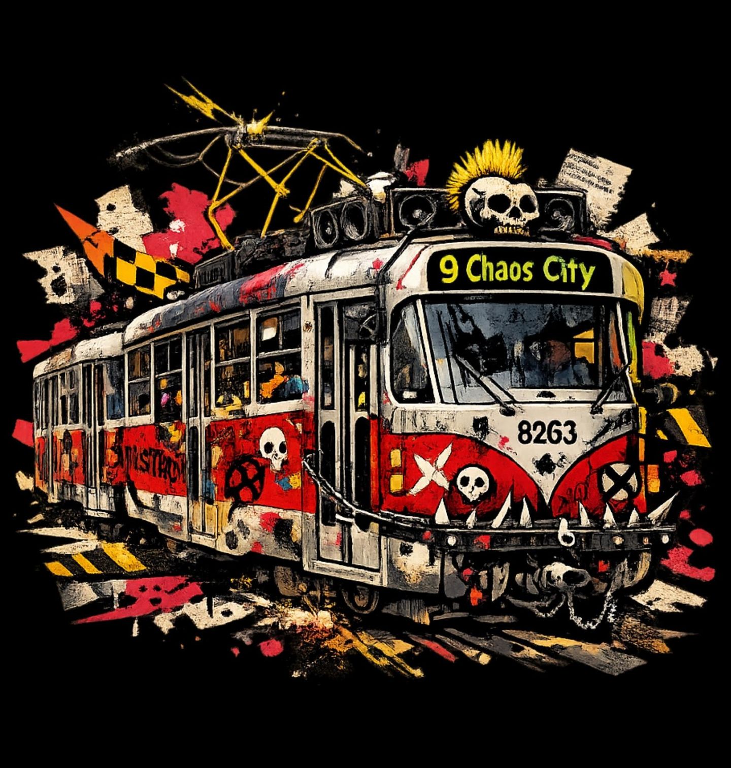 Pánská mikina Punk Tramvaj 9 Chaos City. Dynamický street-art motiv tramvaje pokryté graffiti, lebkami a punkovými prvky. Na čele tramvaje je text “9 CHAOS CITY”, který podtrhuje rebelantskou atmosféru celého designu. Kombinace barev, detailů a chaosu vytváří výrazný vizuální styl inspirovaný městskou kulturou. Ideální pro fanoušky street artu a nekonvenčního designu.