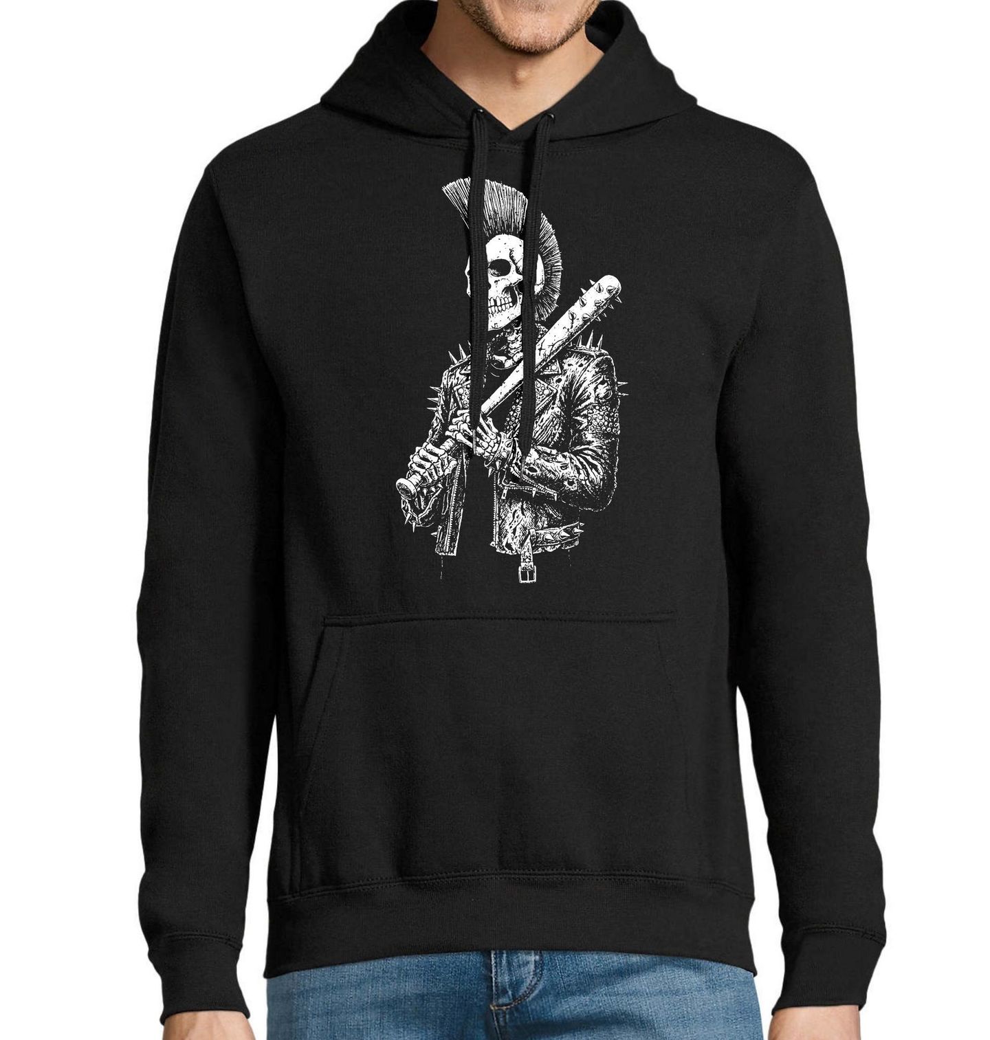 Pánská mikina Punkáč Anarchie. Nezaměnitelný motiv, kde dominuje detailní lebka v roli pravého pankáč, oblečená v kožené bundě s ostny a s ikonickým čírem. V rukou drží pálku s hroty, což dodává celému designu ještě větší dávku rebelie, síly a nekompromisního postoje. Tento motiv je perfektní pro všechny, kteří milují punk, rock a výraznou alternativní módu.