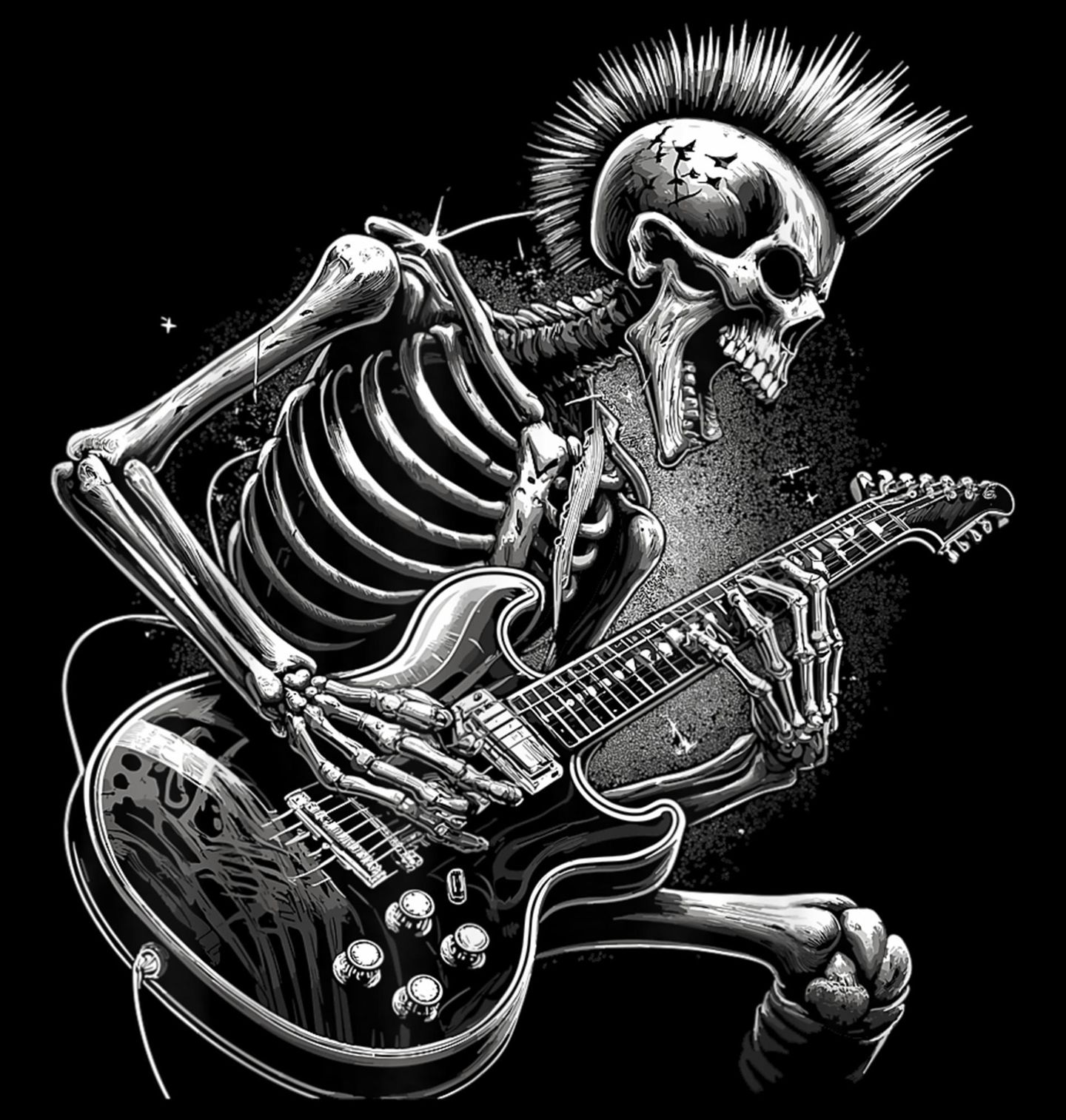 Dámské tričko Punkáč Kostlivec s Čírem. Drsný, syrový a naprosto nekompromisní motiv, kde hlavní roli hraje rozjetý kostlivec s čírem na hlavě, který do strun řeže s energií pravého punk stylu. Otevřená lebka v řevu, napjaté kosti a temná elektrická kytara vytváří výbušnou kombinaci, která symbolizuje svobodu, vzdor a hudbu bez pravidel.