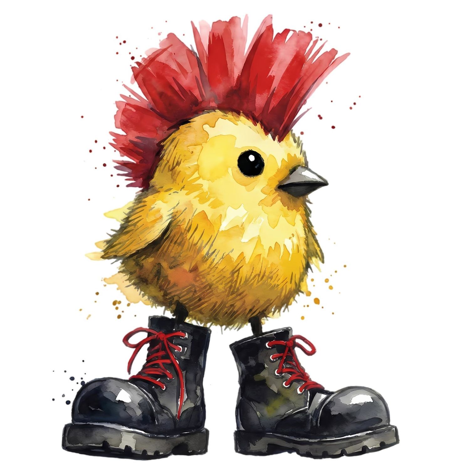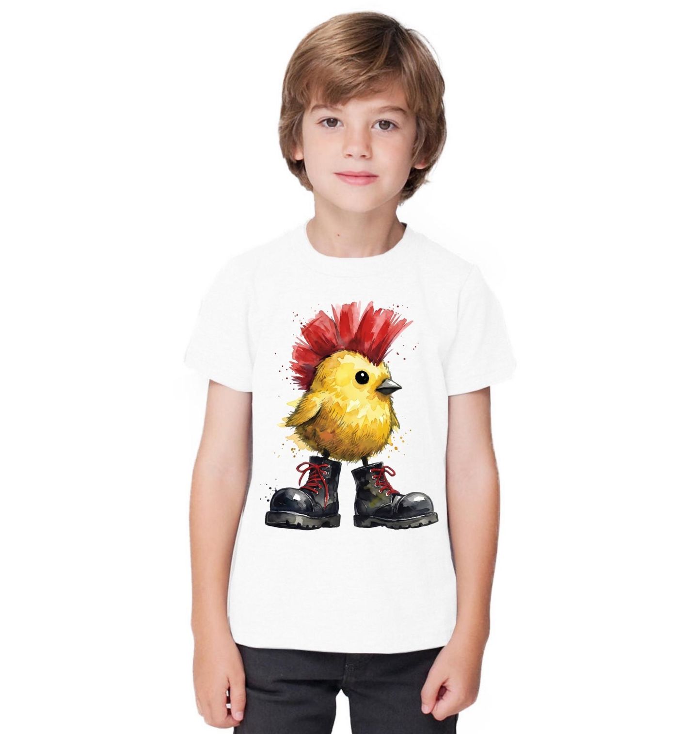 Dětské tričko Punkáč Kuře s Čírem. Originální a vtipný motiv, kde hlavní roli hraje roztomilé, ale zároveň drsné kuře ve stylu pravého pankáč. S výrazným čírem a těžkými botami působí jako malý rebel, který si jde vlastní cestou a nebojí se vyčnívat z davu. Kuře v punk stylu spojuje roztomilost s rebelií a vytváří jedinečný design, který zaujme na první pohled.