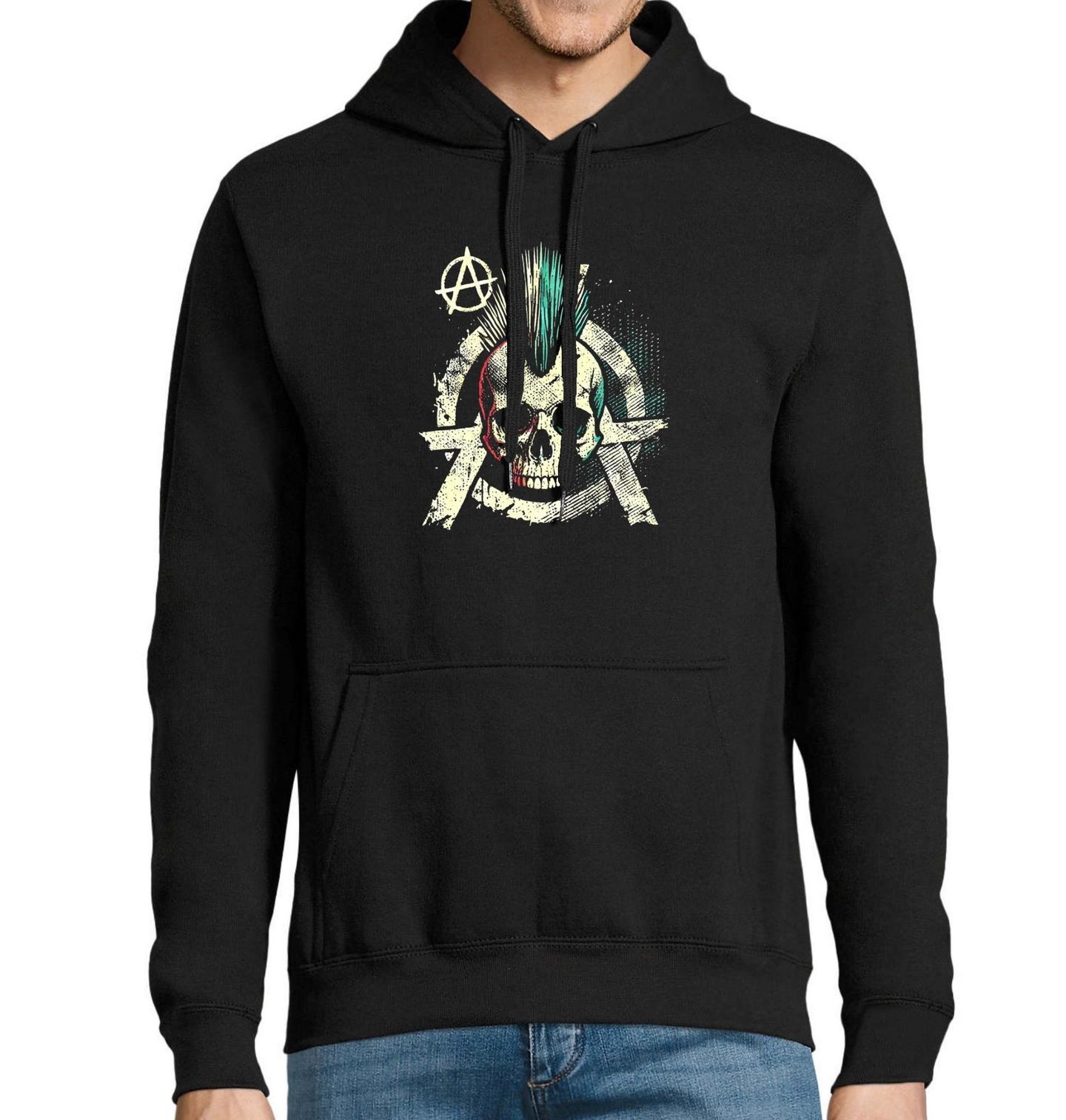 Pánská mikina Punkáčova Lebka Anarchie. Tohle punk tričko je určeno pro každého pankáče, který miluje anarchii a rebelský styl. Designu dominuje lebka s výrazným, barevným čírem, které je symbolem pravého punku. Pozadí zdobí ikonický symbol anarchie, který dává jasně najevo tvůj postoj ke společnosti.