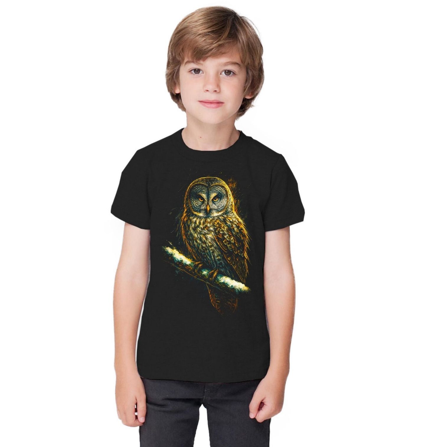 Dětské tričko Puštík vousatý. Puštík vousatý je velká sova z čeledi puštíkovití. Je největším z puštíků, na délku těla přerůstá i výra velkého (postrádá však jeho mohutnost). Tento pták se pohybuje téměř neslyšně a je mistrem maskování, díky čemuž dokonale splývá s okolní přírodou.