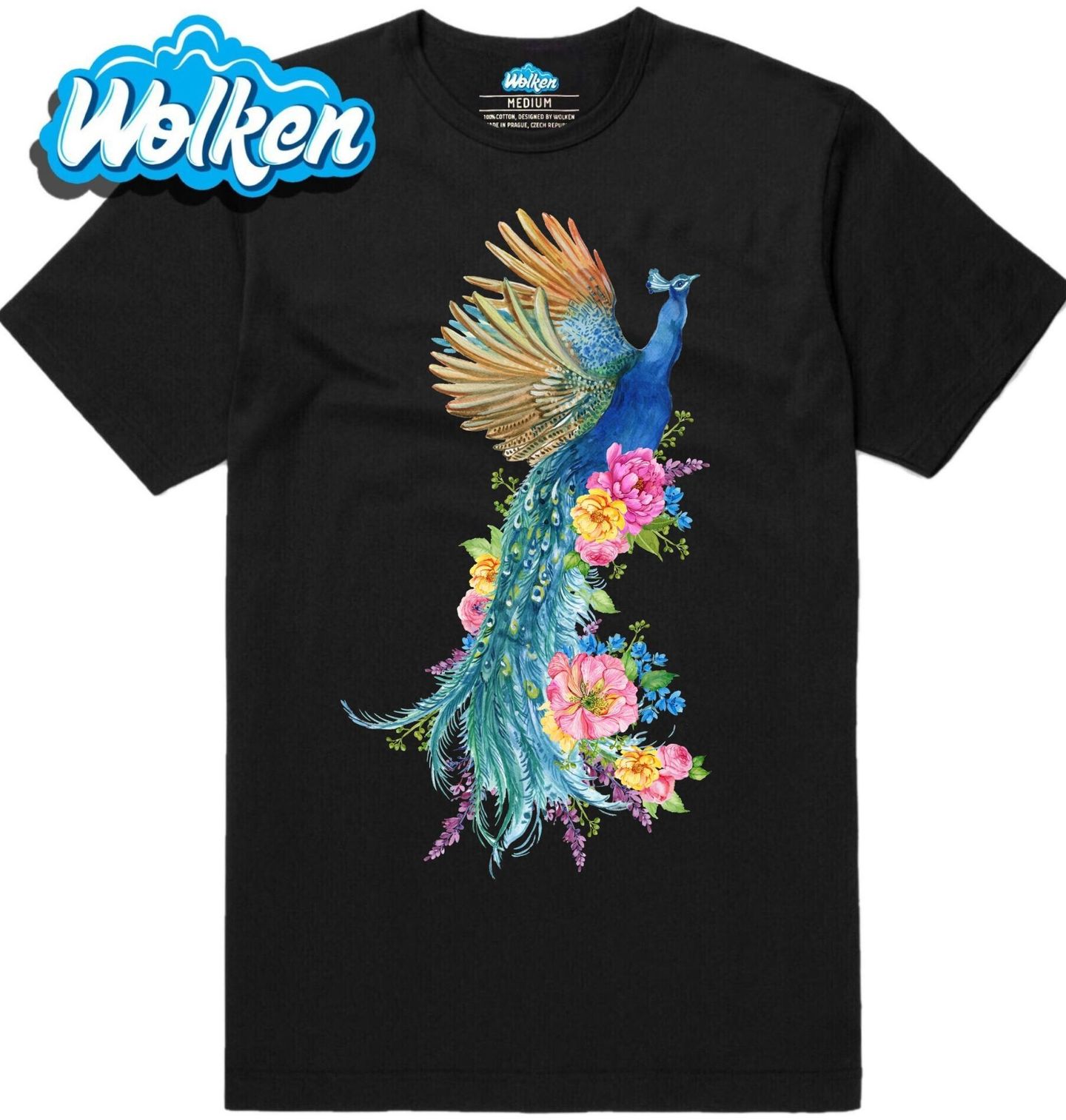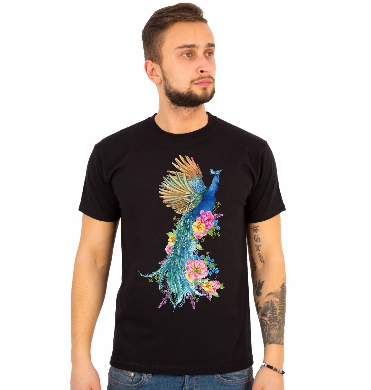 Pánské tričko Pyšný Páv mezi Květinami. Okouzlující motiv páva v elegantním pohybu, obklopeného nádhernými květinami, je ztělesněním elegance, svobody a krásy přírody. Tento design spojuje barevnou majestátnost pávích per s jemností květinových detailů a vytváří nezaměnitelný vizuální zážitek.