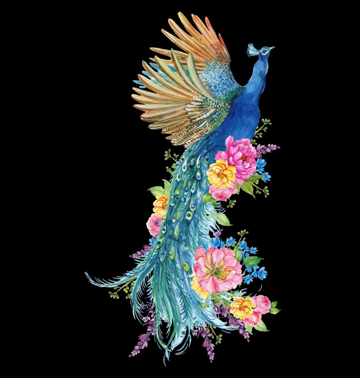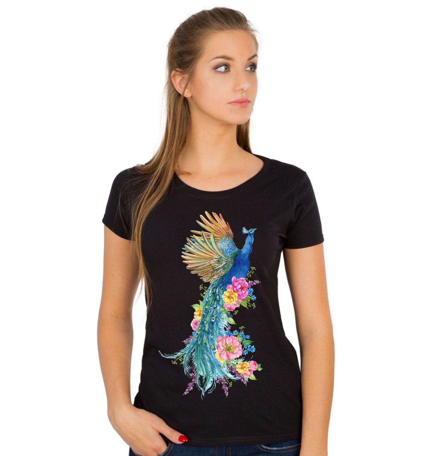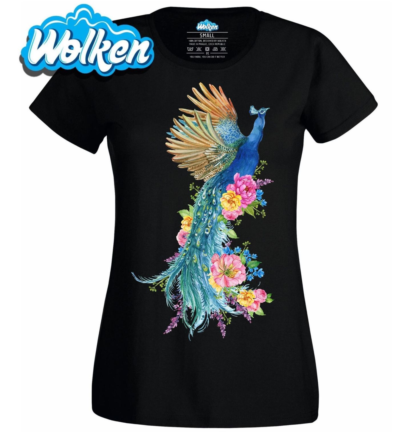 Dámské tričko Pyšný Páv mezi Květinami. Okouzlující motiv páva v elegantním pohybu, obklopeného nádhernými květinami, je ztělesněním elegance, svobody a krásy přírody. Tento design spojuje barevnou majestátnost pávích per s jemností květinových detailů a vytváří nezaměnitelný vizuální zážitek.