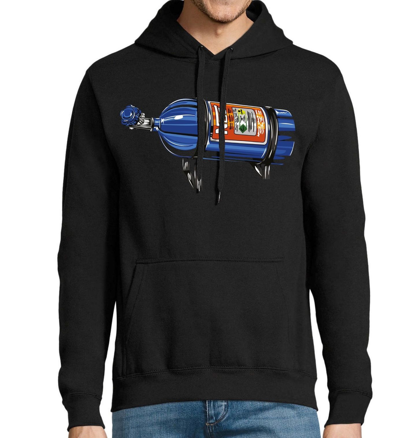 Pánská mikina Racing NOS Láhev Nitrous Bottle. Stylový motiv inspirovaný světem motorsportu a úprav výkonu zobrazuje ikonickou tlakovou láhev používanou pro zvýšení výkonu motoru. Jde o tzv. nitro systém (NOS), tedy láhev s oxidem dusným, která se v tuningu používá pro krátkodobé navýšení výkonu – po aktivaci dodá motoru více kyslíku a auto dokáže prudce zrychlit.