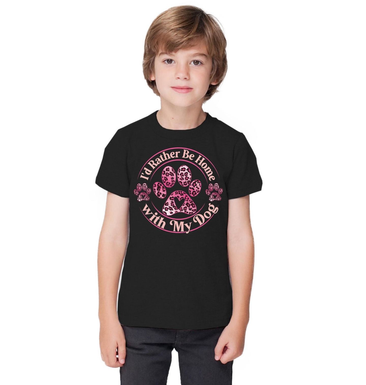 Dětské tričko Raději bych byl doma se svým psem. Stylový motiv s tlapkou a nápisem „I’d Rather Be Home With My Dog“ potěší každého, kdo miluje pes a tráví nejraději čas se svým čtyřnohým parťákem. Design v jemných růžových tónech působí hravě a zároveň elegantně, takže se hodí pro každého, kdo je hrdý pejskař a chce ukázat svou lásku ke psům.