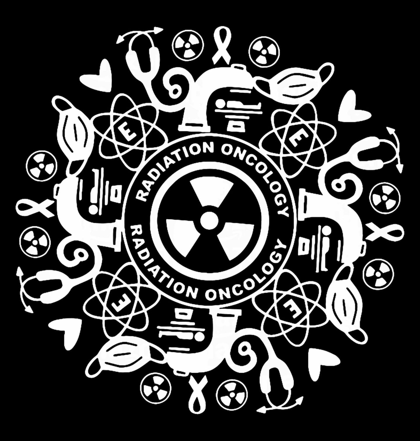 Dámské tričko Radiační Onkologie Radiation Oncology. Okolo je opakovaně uveden anglický text „Radiation Oncology“, což v znamená „radiační onkologie“. Celý motiv je doplněný ikonami jako stetoskop, mikroskop, ochranné masky, srdíčka, stužky a atomové symboly. Design je ideální jako potisk pro všechny, kdo mají blízko k oboru zdravotnictví,