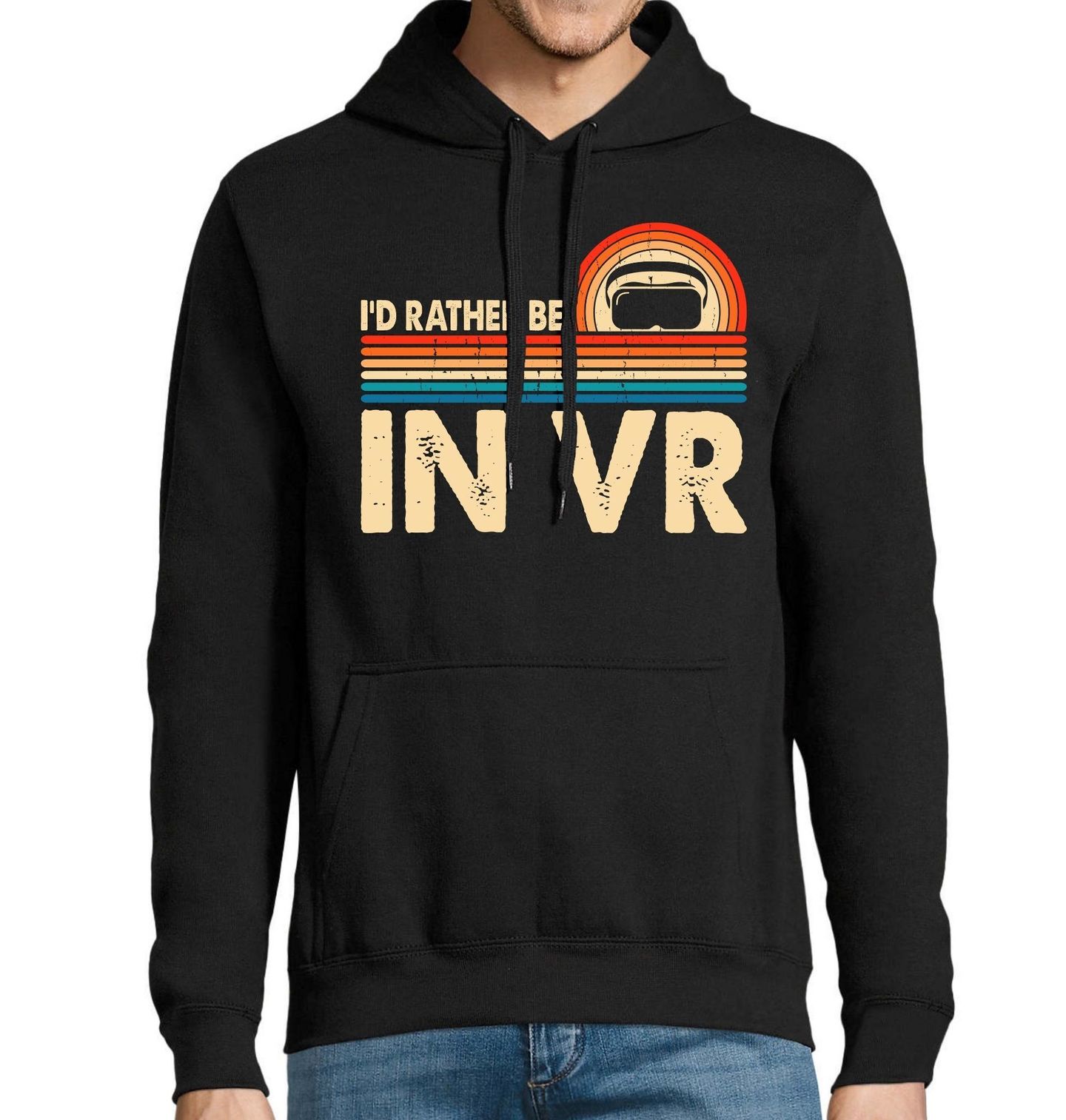 Pánská mikina Radši Bych Byl ve Virtuální Realitě. Stylový retro design s výrazným nápisem “I’D RATHER BE IN VR” (v překladu „Radši bych byl ve virtuální realitě“). Motiv doplňuje silueta VR headsetu a barevné retro pruhy v teplých tónech, které evokují vintage styl 80. let. Tento design je ideální pro fanoušky virtuální reality, gamerů i technologických nadšenců.