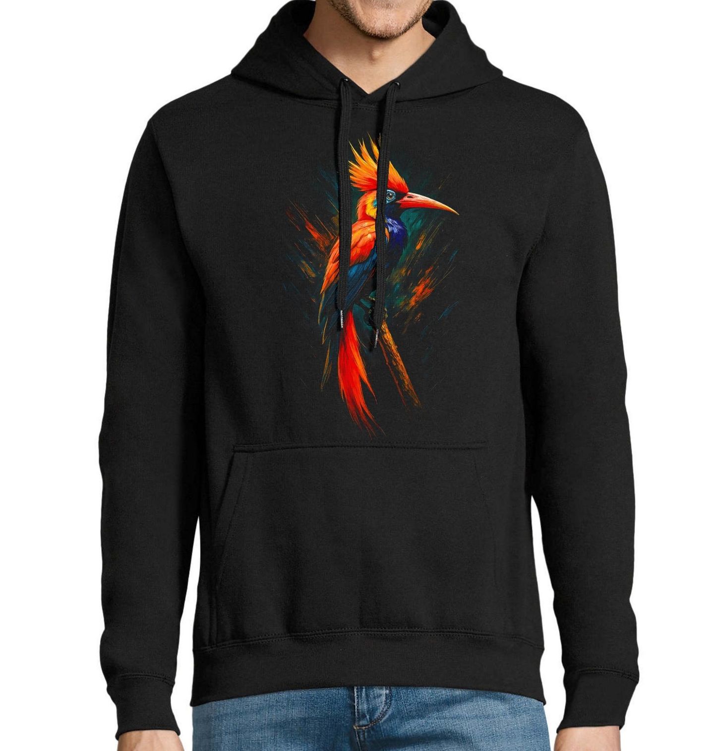 Pánská mikina Rajka Bird of Paradise. Výrazný motiv zobrazuje exotický pták rajka, známý svým nádherným peřím a elegantní siluetou. Rajka patří mezi nejkrásnější druhy tropických ptáků a symbolizuje svobodu, energii i jedinečný styl. Tento umělecký design zvýrazňuje syté barvy a dynamiku, díky čemuž se pták rajka stává nepřehlédnutelným prvkem každého produktu.
