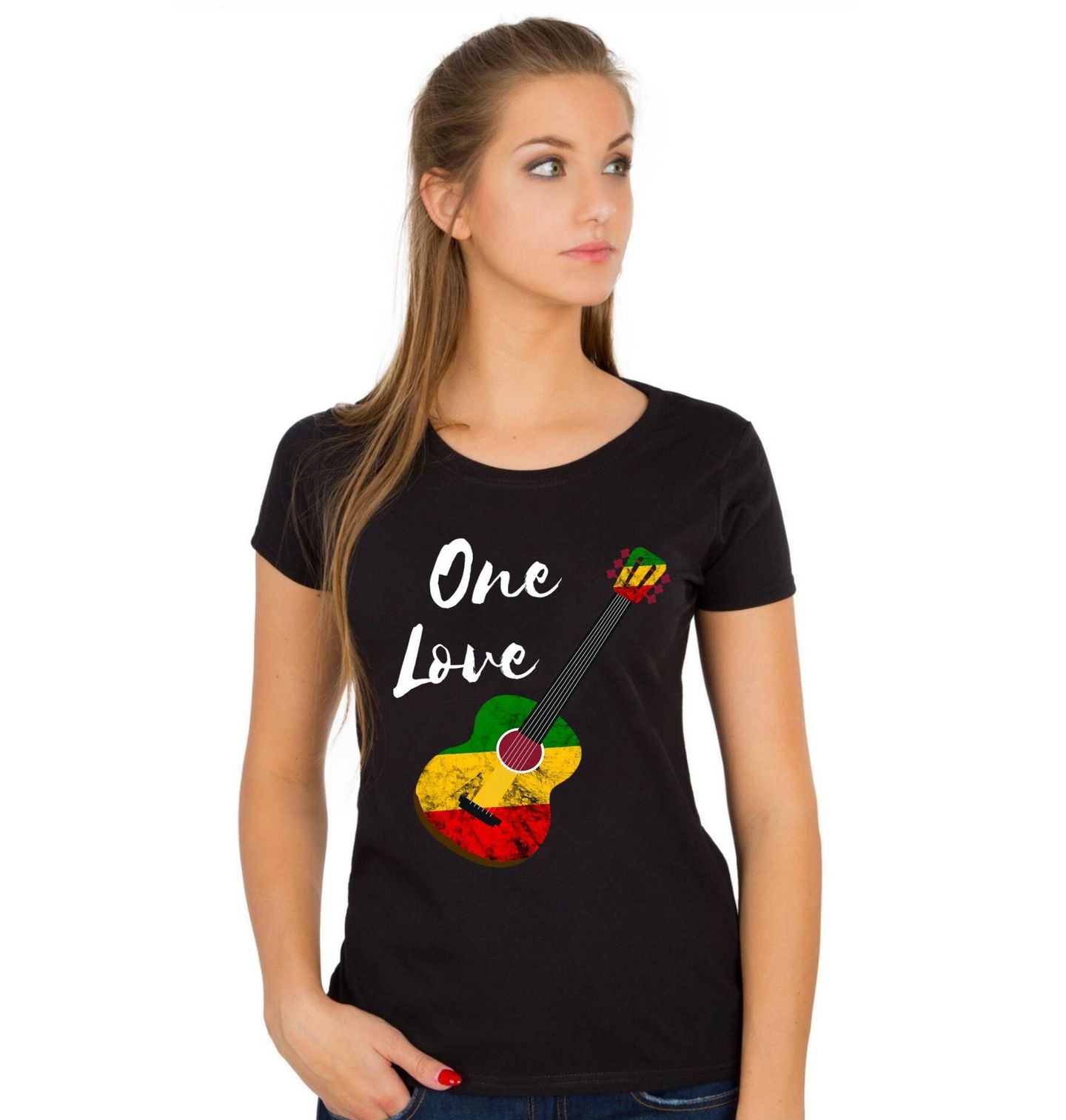 Dámské tričko Rasta Kytara One Love. Stylový hudební motiv s nápisem „One Love“ a výraznou kytara v barvách rasta – zelená, žlutá a červená. Design spojuje pozitivní energii, svobodu a lásku k hudbě do jednoho silného vizuálu. Kytara zde symbolizuje rytmus, pohodu a spojení lidí skrze hudbu. Nápis „One Love“ vyjadřuje myšlenku jednoty a lásky, kterou proslavil Bob Marley.