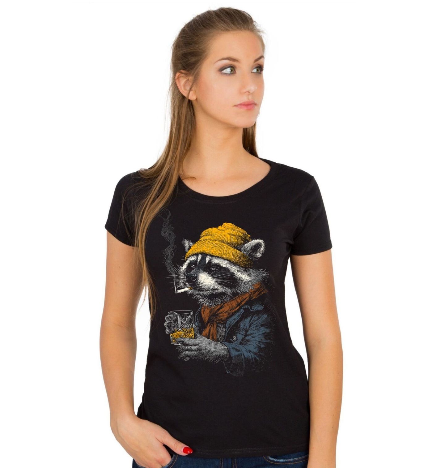 Dámské tričko Rebel Mýval s Whisky. Stylový design zachycuje mývala v čepici a šále, který drží sklenici whisky a kouří cigaretu. Tento motiv kombinuje humor, rebelský styl a městskou atmosféru. Mýval působí jako drsný, ale charismatický hrdina nočního života, což dělá z tohoto designu výrazný a originální motiv.
