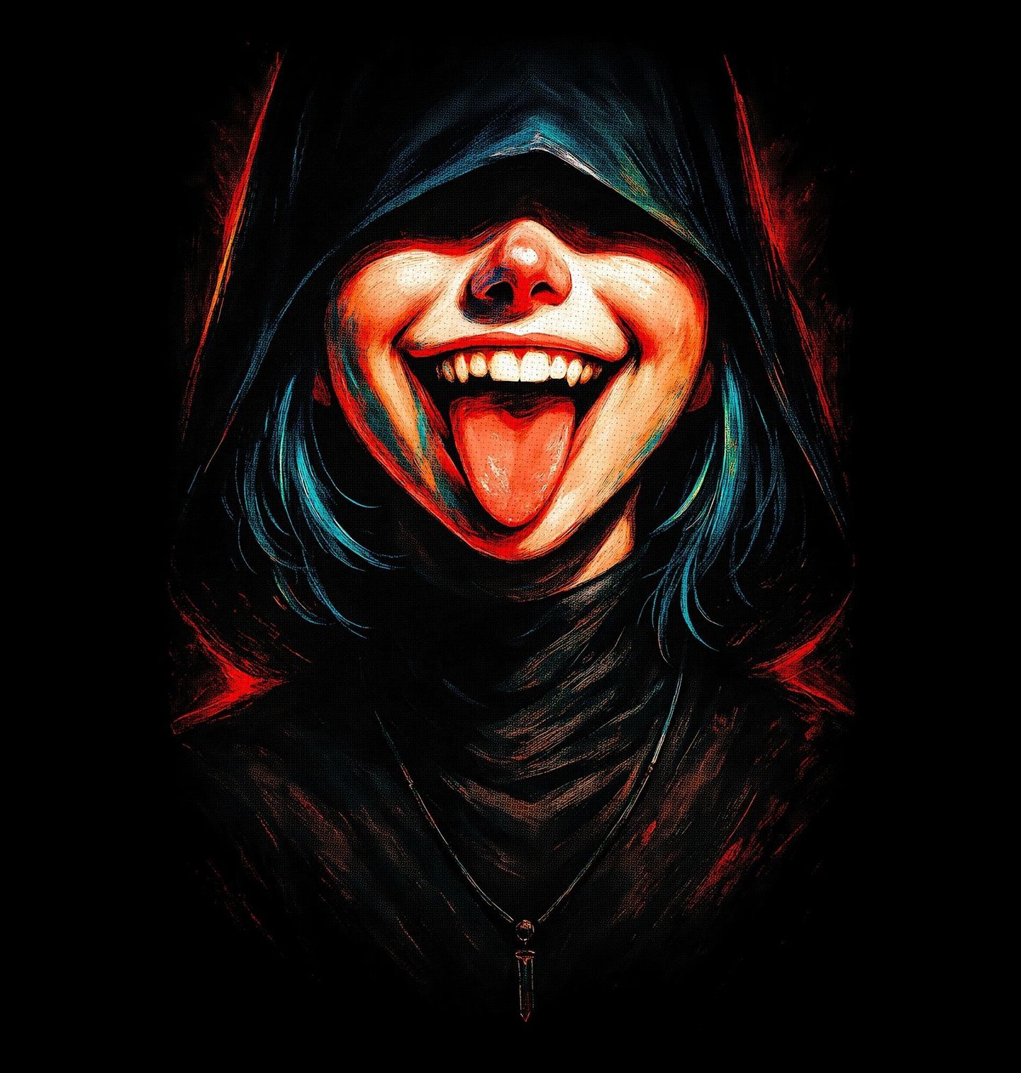 Pánské tričko Rebelka s Vyplazeným Jazykem. Provokativní a výrazný motiv zachycuje tajemnou postavu v kapuci, která se s drzým úsměvem a vyplazeným jazykem vysmívá pravidlům i konvencím. Tento design působí jako symbol svobody, vzdoru a nespoutané energie. Ideální pro všechny, kdo mají rádi výrazné, lehce provokativní motivy a chtějí dát najevo svůj postoj.