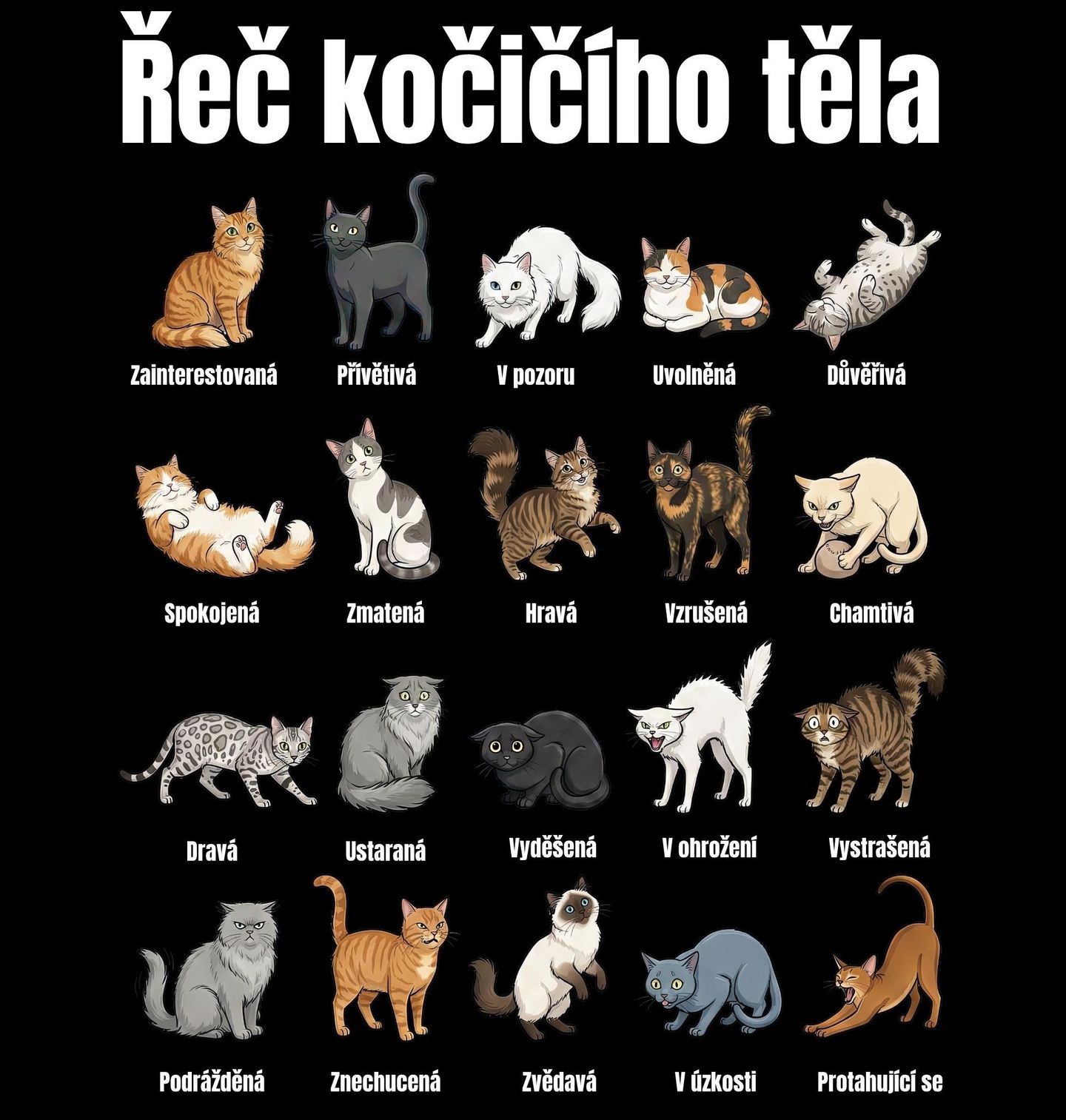Dámské tričko Řeč Kočičího Těla. Originální a zábavný motiv ukazuje, jak kočka komunikuje pomocí řeči svého těla. Každá kočka má své specifické postoje a výrazy, které prozrazují její náladu i emoce. Na motivu najdeš různé stavy, které kočka prožívá: zainteresovaná, přívětivá, v pozoru, uvolněná, důvěřivá, spokojená, zmatená, hravá, vzrušená, chamtivá, dravá, ustaraná, vyděšená atd.